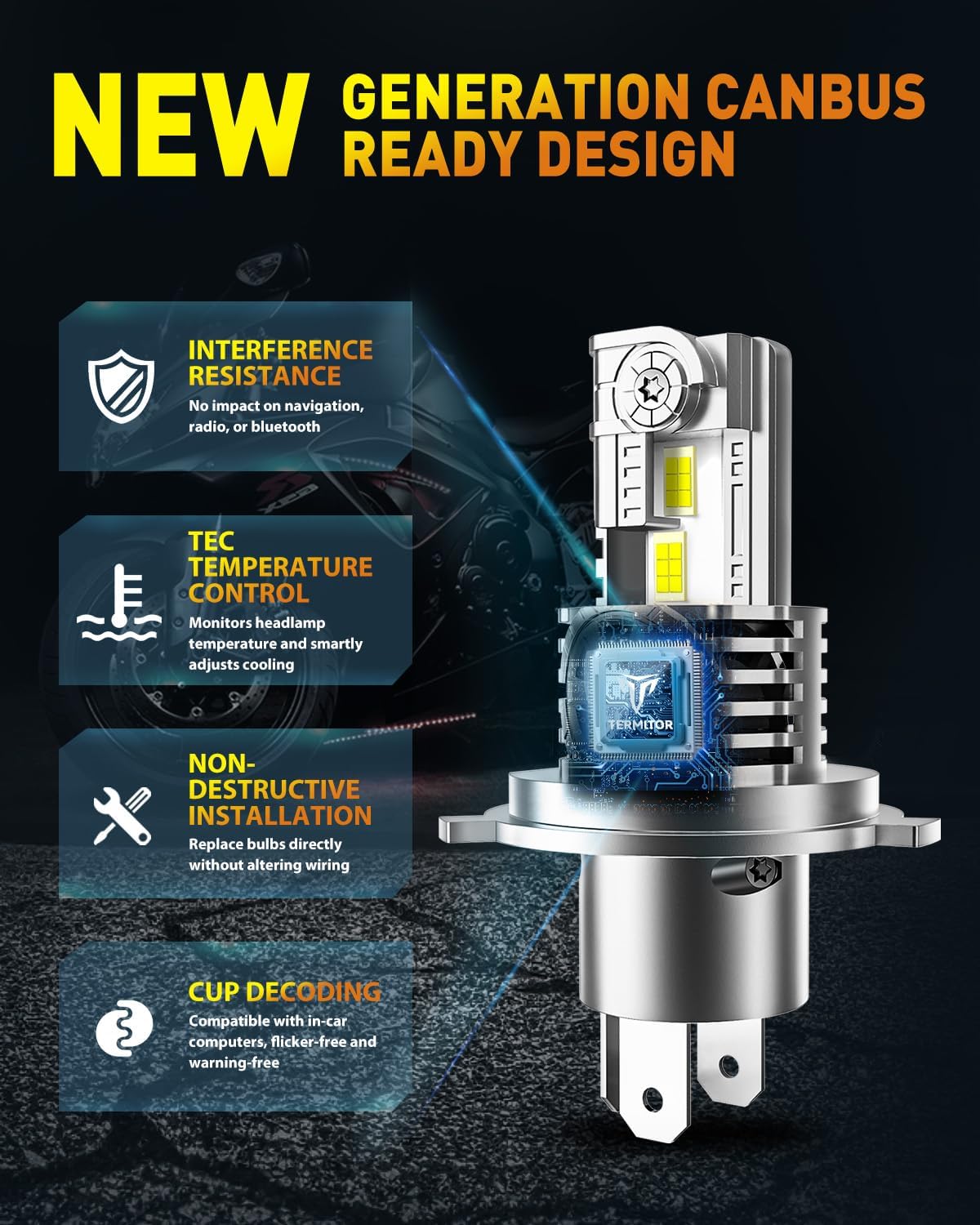 - CANBUS-Ready for 95% Motorcycles: The H4/9003/HB2 driving light bulb is compatible with 95% of motorcycle computer systems, ensuring error-free performance without radio interference. Note: A few vehicles may require an additional CAN bus decoder for proper installation.