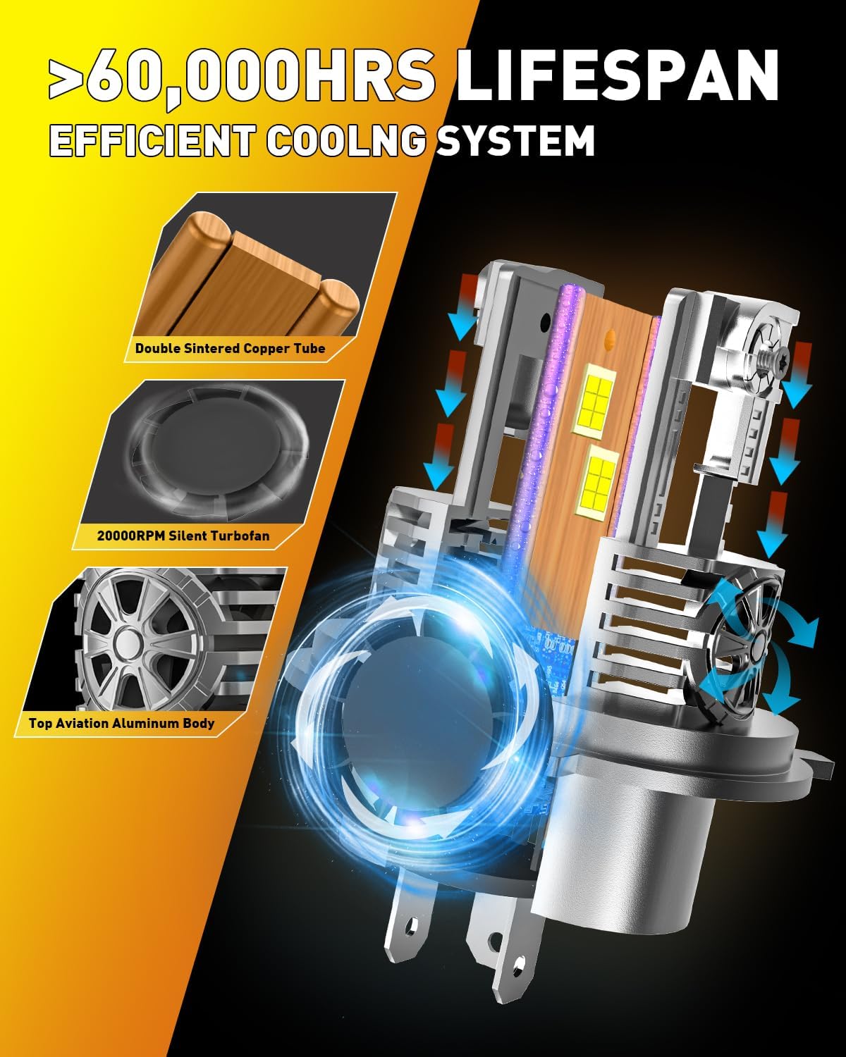- Durable Design—70,000 Hours Lifespan: Constructed with aviation-grade aluminum and a hollow-carved design, these H4/9003/HB2 motorcycle light bulbs feature a high-speed 22,000 RPM silent cooling fan. Their IP68 waterproof function ensures reliable performance in harsh weather, including snowstorms and heavy fog