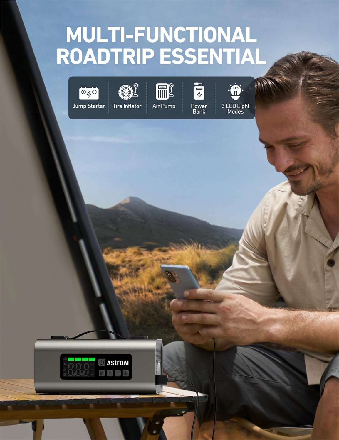 - Multifunctional - The MF159 jump starter includes 3 key integrated functions. It's a 14800 mAh portable car jump starter, up to 150 PSI air compressor, and a 220 L/min air pump. It can also be used as a power bank and LED flashlight. This 3-in-1 multi-function tool is a must-have in any road trip kit.