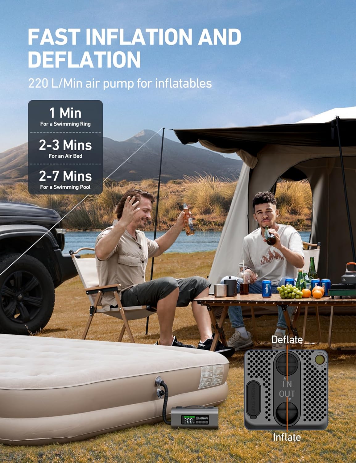- Fast Inflation & Deflation Air Mattress Pump - The AstroAI MF159 Jump Starter achieves fast inflation & deflation in minutes. It includes an air hose and 4 different nozzles to inflate or deflate air mattresses, lounges, rafts, waterbeds, boats, and other large inflatables. Its automatic shutoff design allows for supervision-free inflation and deflation, reducing exposure to noise. When you inflate, please align the hose and accessory nozzle, twist them clockwise along the threads.