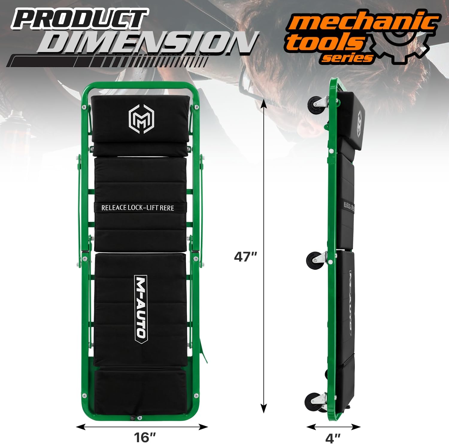 M-AUTO Heavy-Duty Convertible Mechanic Creeper, Z-Creeper 2-in-1 Creeper and Seat 48" Padded Adjustable Headrest Roller Garage Chair with 7 Swivel Casters for Washing, Detailing, Maintenance, Green