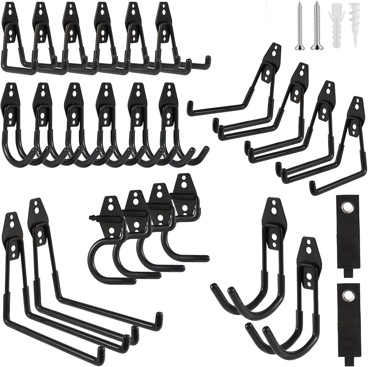 - ZexHok Wall Hook Assortment Set: 26 pack storage hooks organizer include with 6 sizes: 6pcs small J hooks, 6pcs small U hooks, 2pcs large J hooks, 4pcs middle U hooks, 2pcs large U hooks, 4pcs S hooks and 2pcs straps for hanging tools of different sizes and weight.