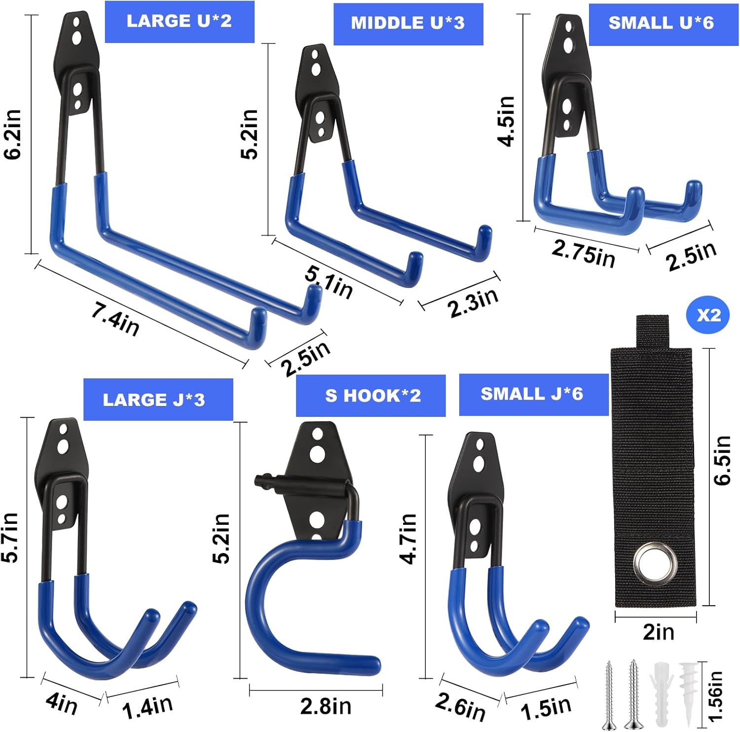 - ZexHok Wall Hook Assortment Set: 24 pack storage hooks organizer include with 6 sizes: 6pcs small J hooks, 6pcs small U hooks, 3pcs large J hooks, 3pcs middle U hooks, 2pcs large U hooks, 2pcs S hooks and 2pcs straps for hanging tools of different sizes and weight.