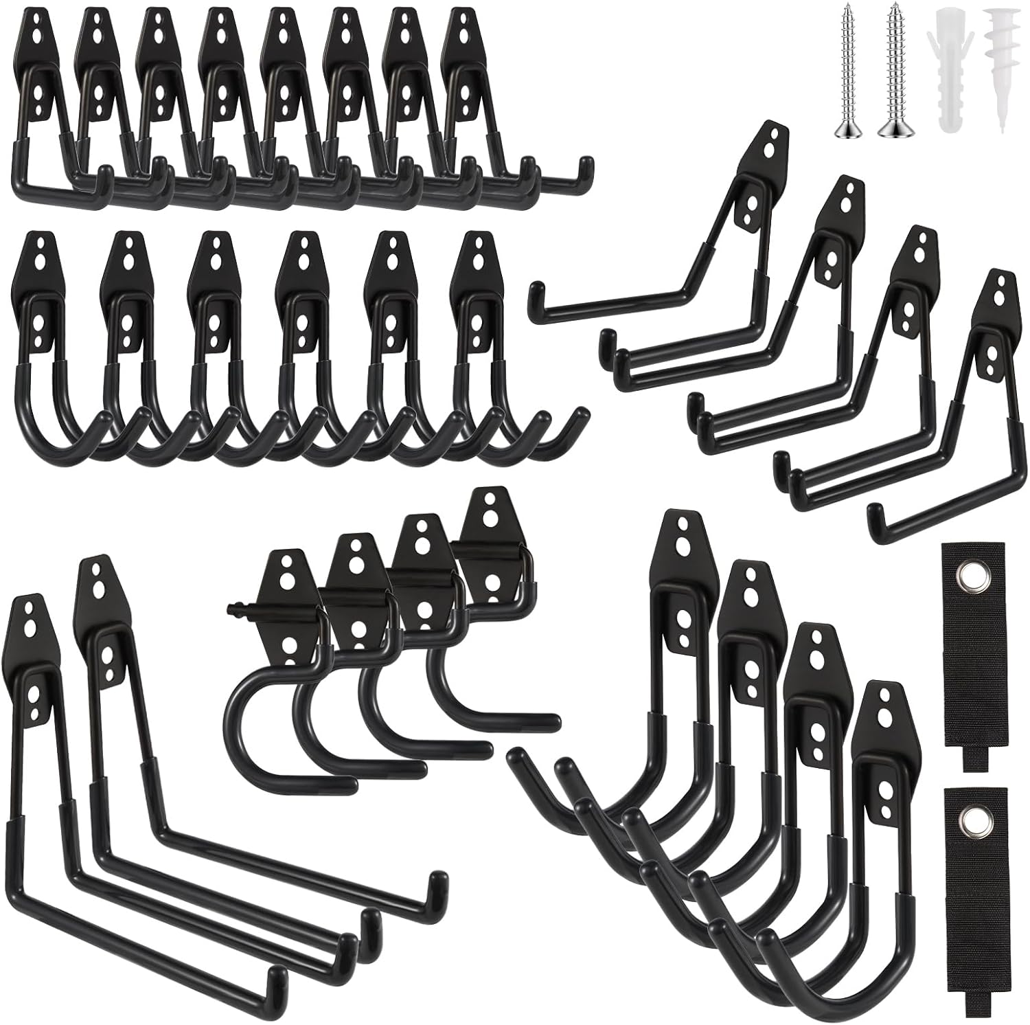 - ZexHok Wall Hook Assortment Set: 30 pack storage hooks organizer include with 6 sizes: 6pcs small J hooks, 8pcs small U hooks, 4pcs large J hooks, 4pcs middle U hooks, 2pcs large U hooks, 4pcs S hooks and 2pcs straps for hanging tools of different sizes and weight.