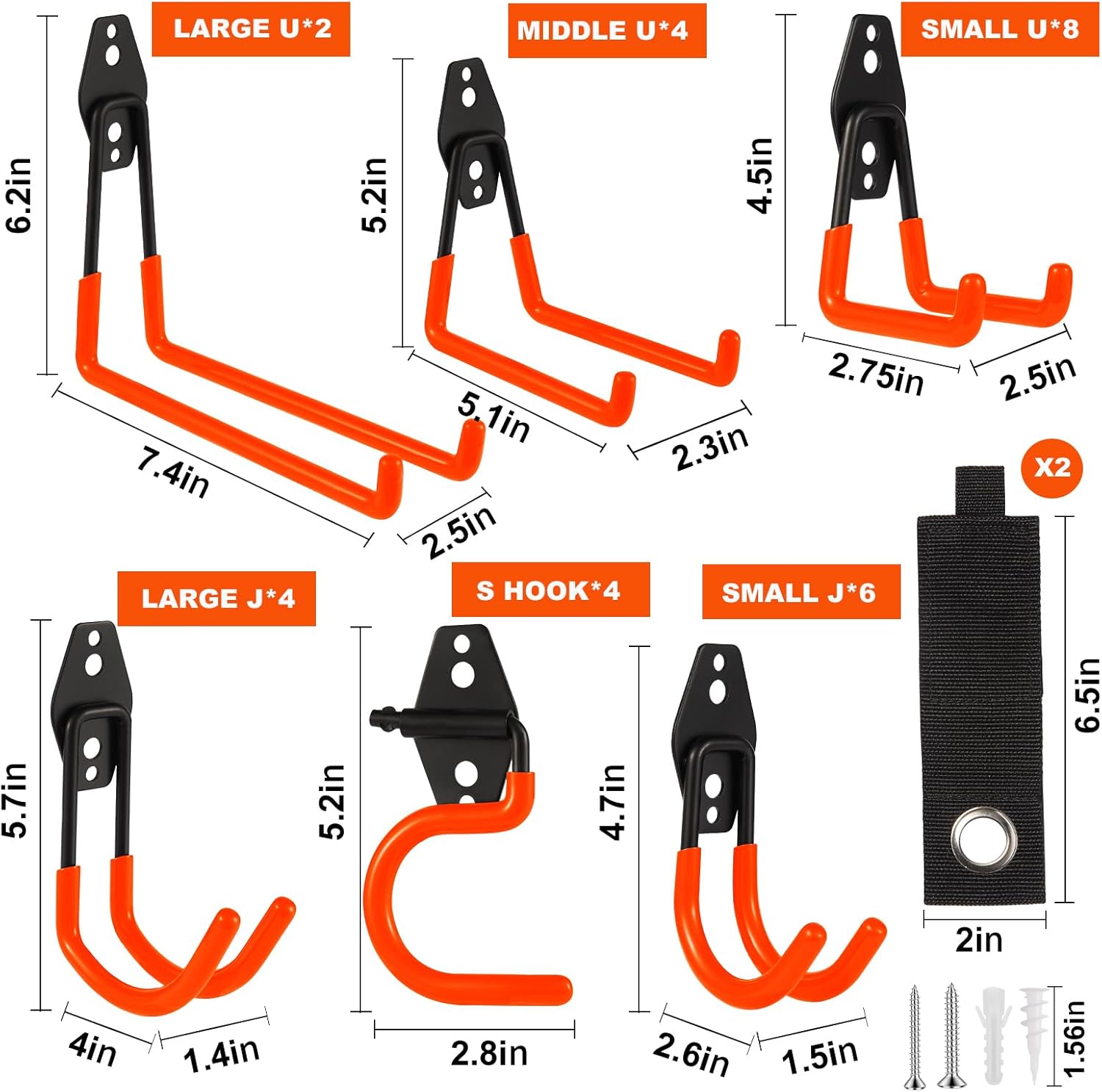 - ZexHok Wall Hook Assortment Set: 30 pack storage hooks organizer include with 6 sizes: 6pcs small J hooks, 8pcs small U hooks, 4pcs large J hooks, 4pcs middle U hooks, 2pcs large U hooks, 4pcs S hooks and 2pcs straps for hanging tools of different sizes and weight.