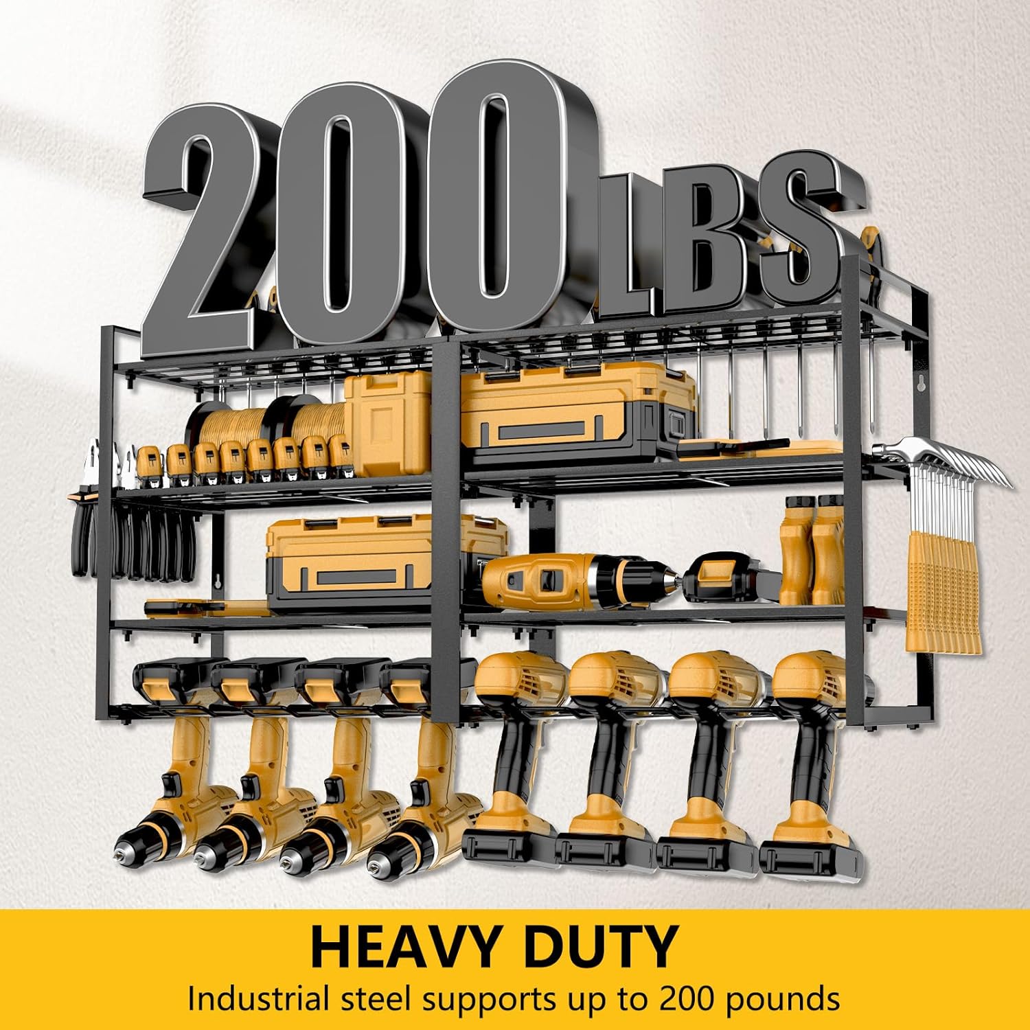 - LARGE CAPACITY DESIGN: Power tool storage rack with 4 layers and 8 drill holders. This wall mount power tool organizer features a 4-tier design with ample space. It holds up to 8 cordless drills in the bottom tier, the height of the middle shelf is 5.1'', which is enough to accommodate heavy-duty or small-sized tools. And a hammer holder, pliers holder and screwdriver holder are added to the side.