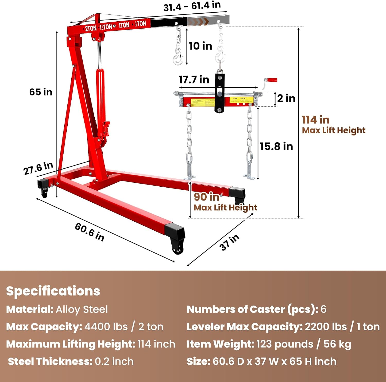 - Precision engine leveler: Engine hoist constructed of heavy-duty alloy steel for durability and shape retention. Engine lift with load leveler can hold up to 4,400 lbs/2 ton, cherry picker exceeds industry standards and comes equipped with an 8-ton hydraulic pump, making it the perfect solution for handling heavy-duty engines
