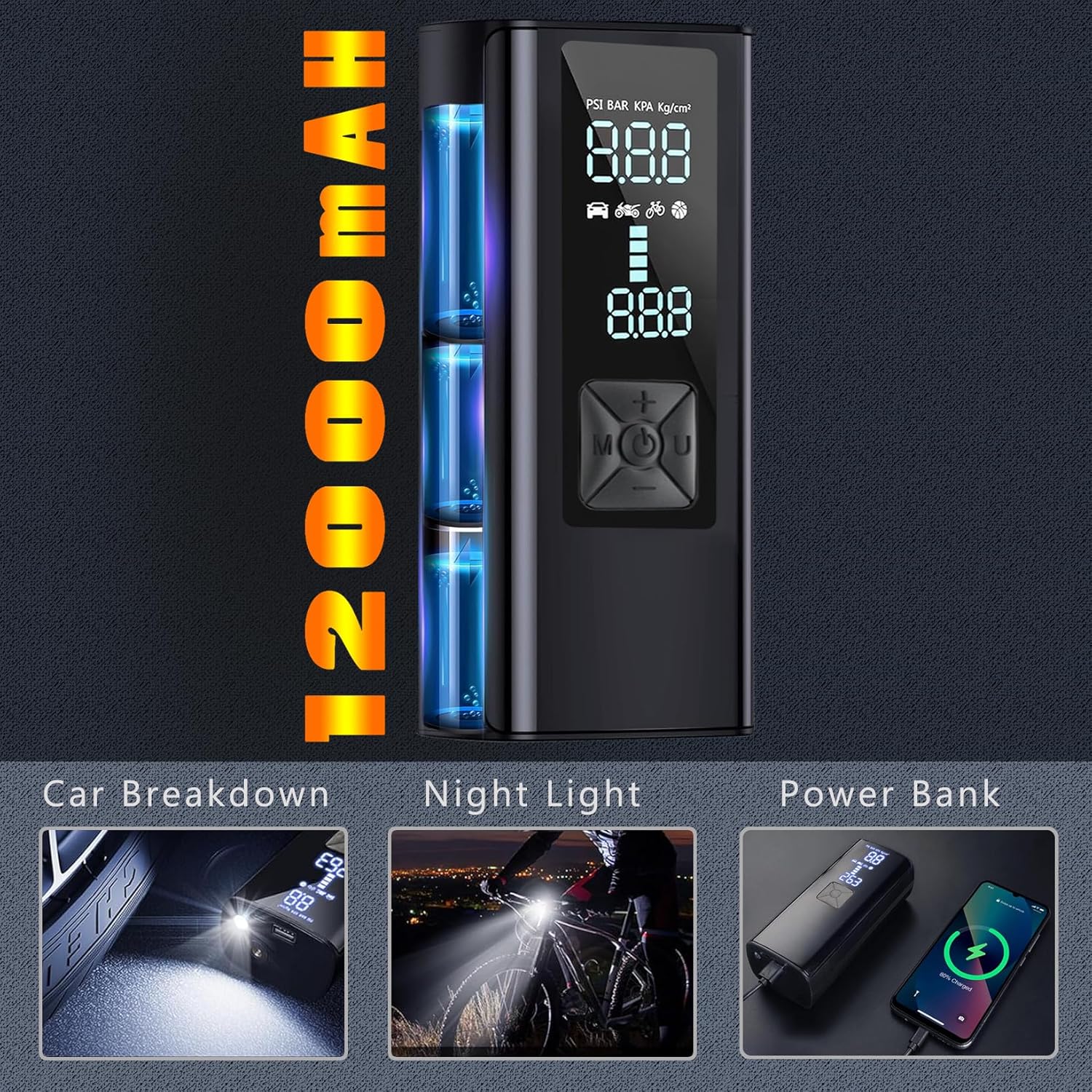 - 【Rechargable Air Compressor】:lightweight air pump, with a storage bag.It features both a USB-C input port and a USB-A output port,allowing for versatile power options,making it suitable as a power bank for cell phones and other electronic devices.Ideal for Cars,Motor,Bike tire inflator,.etc.