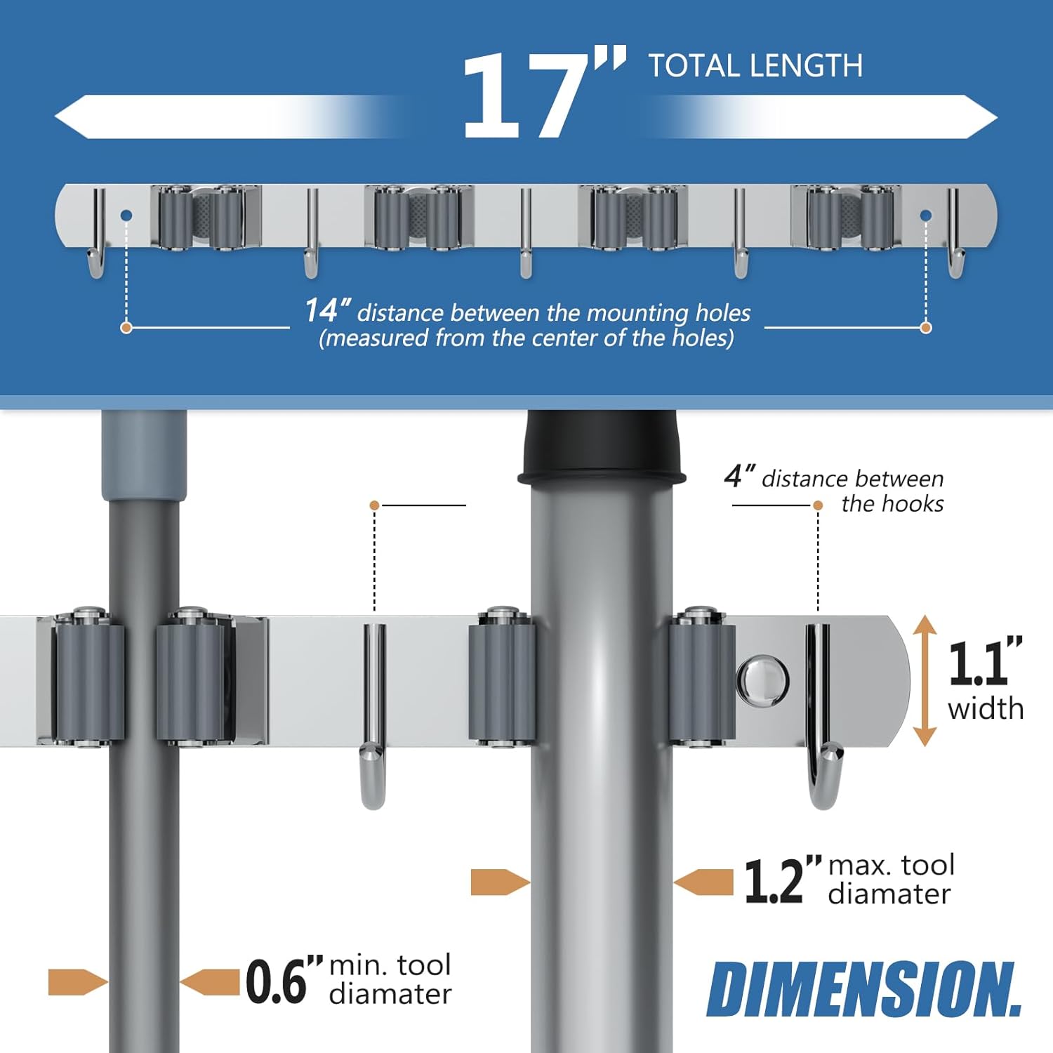 - 【Multi-Purpose Storage Solution】Securely holds brooms, mops, shovels, garden tools, and even umbrellas. Adjustable hooks and non-slip pads keep items stable, preventing falls and clutter. Perfect for households, workshops, or commercial spaces.