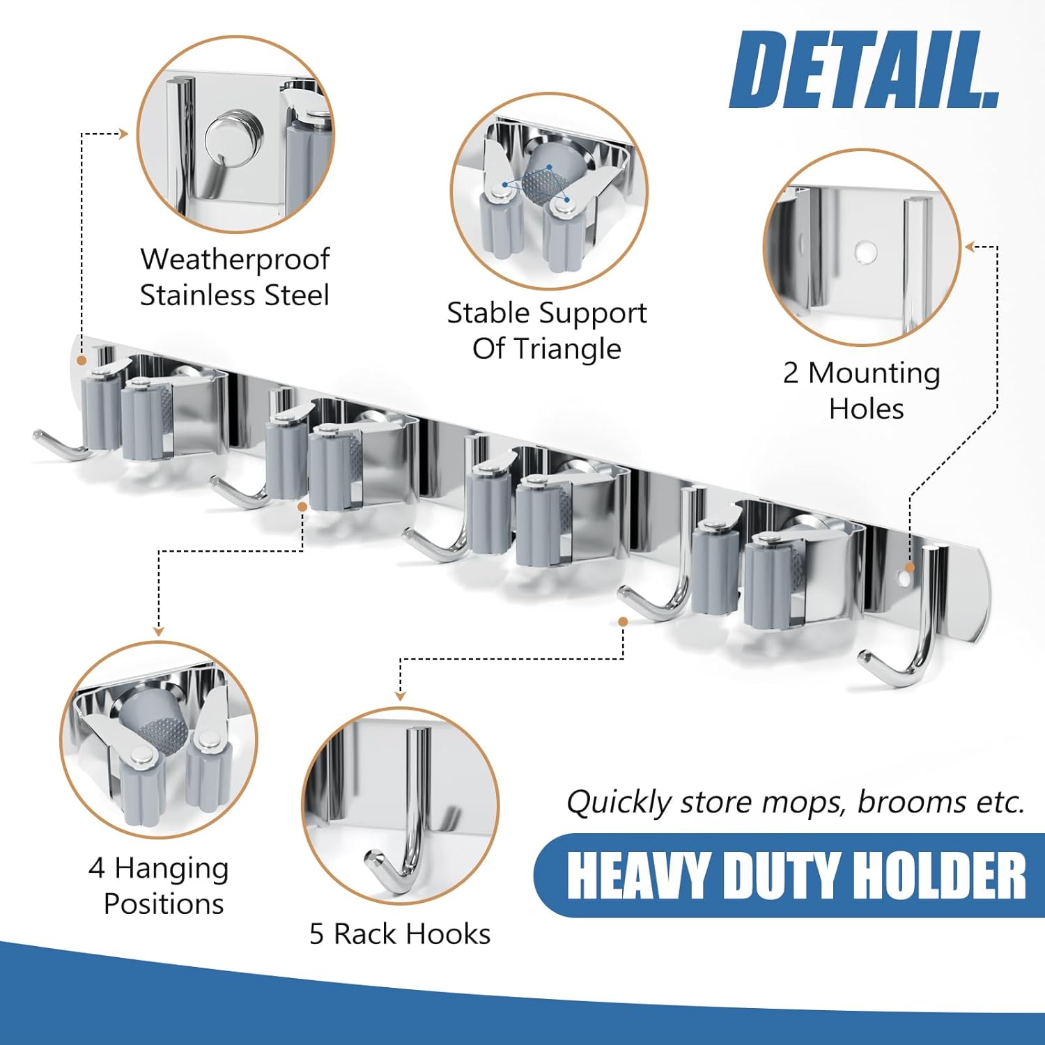 Wall Mounted Broom and Mop Organizer, Heavy Duty Stainless Steel Storage Rack for Brooms, Mops, Tools Space Saving Home Garage Organization (4 Racks with 5 Hooks)