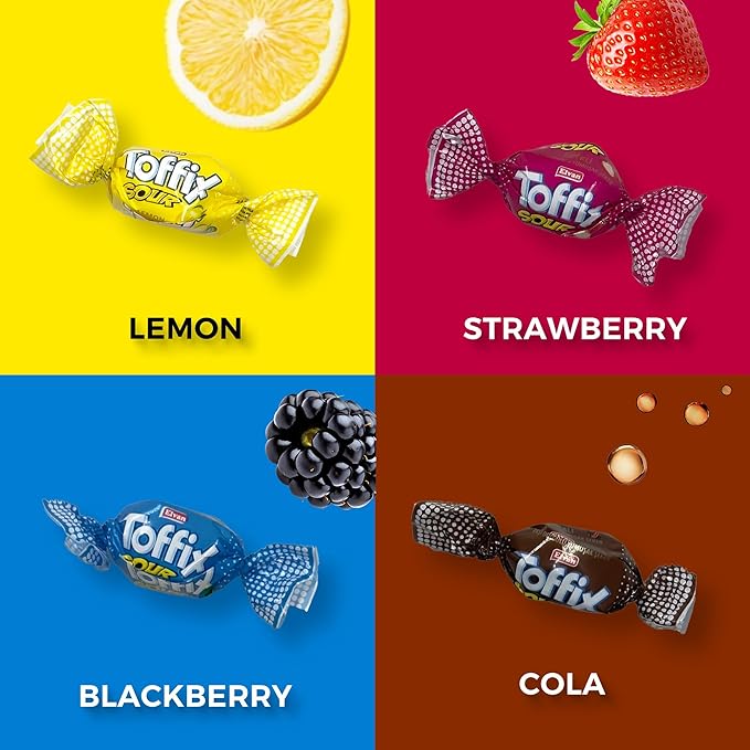 Toffix Sour Chews, Center-Filled Soft Chewy Candy, 250 Pieces of Individually Wrapped Snacks for Kids & Adults, Strawberry, Blueberry, Lemon & Cola Flavored Chewy Candies - 2 Pound Bulk Bag