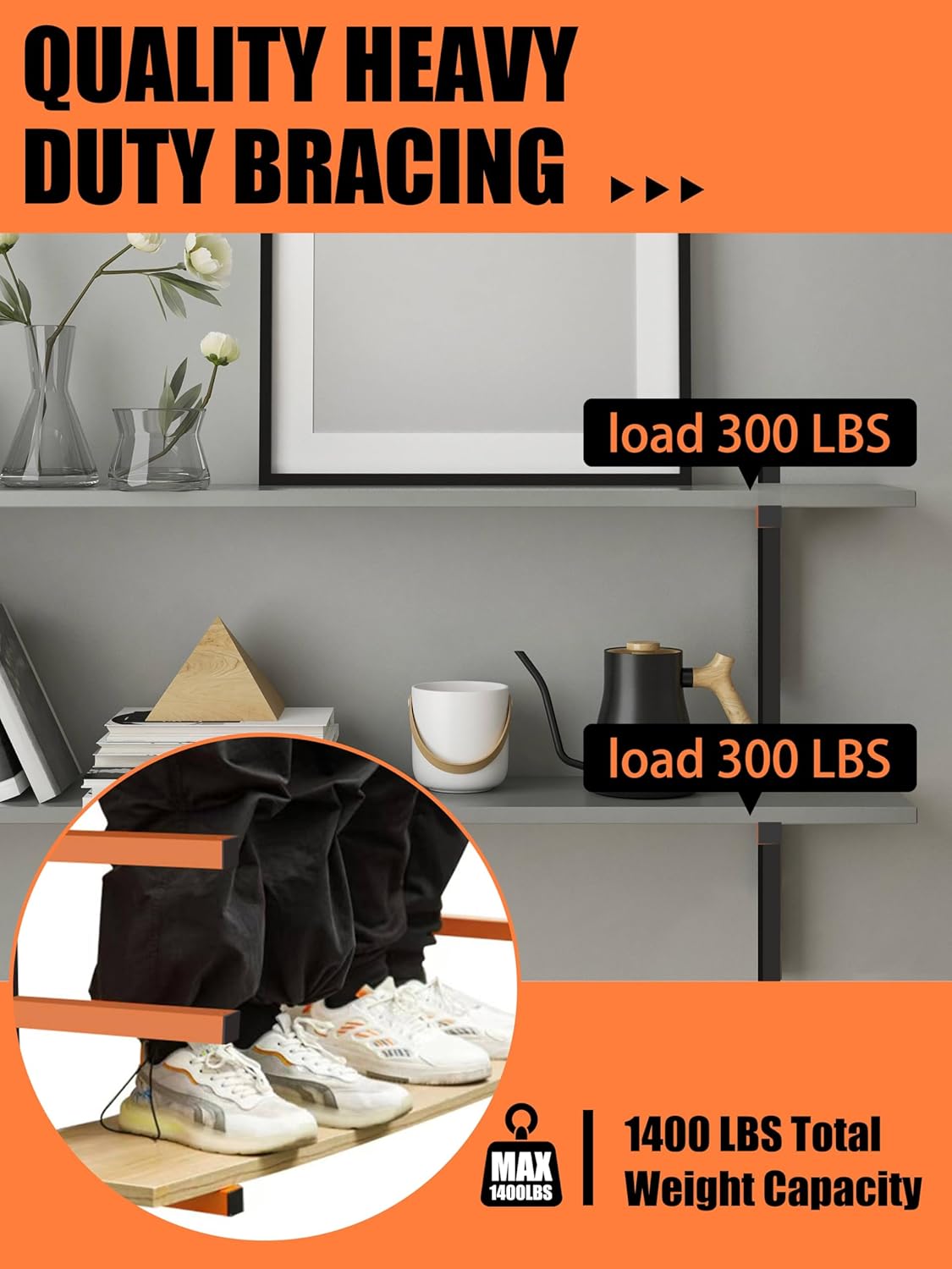 - Heavy-Duty Construction, Holds Up to 1400 lbs: This garage wall shelving is designed to support heavy loads up to 1400 lbs. Good for storing lumber, tools, and other garage essentials securely