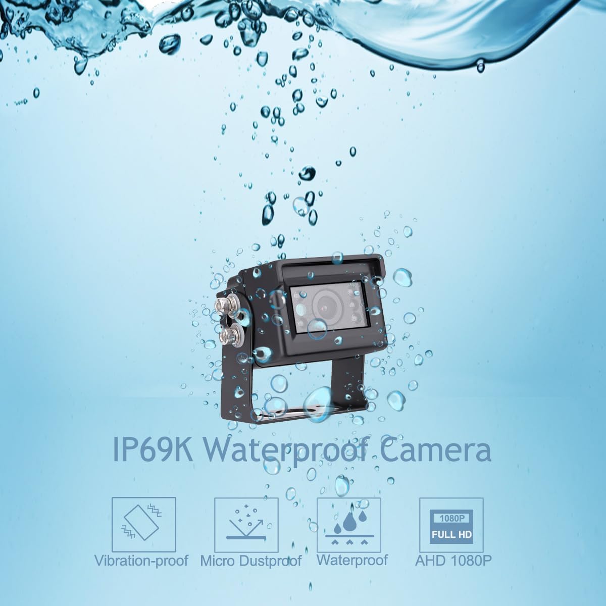 - 【HEAVY DUTY CAMERAS】They are color cameras with the resolution of 1080P, provides super clear and real color image. The viewing angle is 120 degree. With waterproof rating IP69K(the highest level), with night vision. So it works perfectly in kinds of weathers. With Heavy duty, 10G vibration-proof rating, it works well with the vehicle which has intensive vibration in extreme conditions.