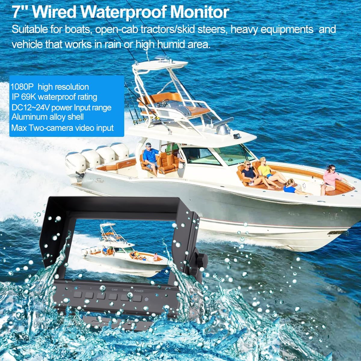 - 【APPLICATIONS】AHD 1080P wired two-camera system, waterproof camera and wateproor monitor. For its high vibration resisance ability of 10G and wide power input range DC12-24V, it is suitable for boats, open cab vehicle, buses, box trucks, pickup trucks, garbage trucks, flatbed trucks, dump trucks, street sweeper trucks, refrigerator trucks, motor homes, vans, skid steers, farm tractors, combines, cotton pickers, crop sprayers, bulldozers, snow plows, forklifts, excavators, heavy equipments,etc.