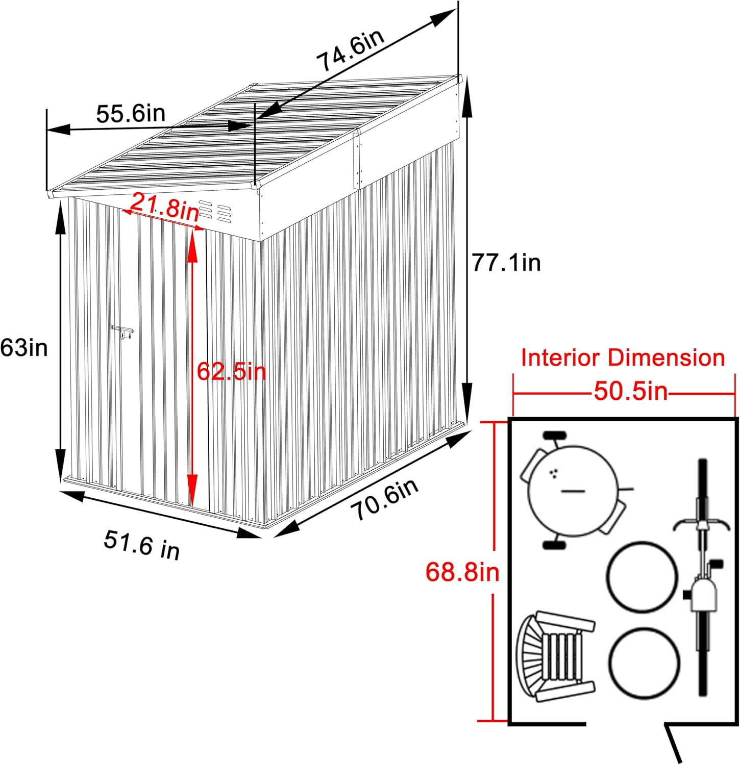 - Dimensions - The overall size of assembled outdoor storage shed: 55.6"W x 74.6"D x 77.1"H. Interior size: 50.5"W x 68.8"D. Door size: 21.8"W x 62.5"H. Make sure you are permitted to build a shed from your local before purchase.