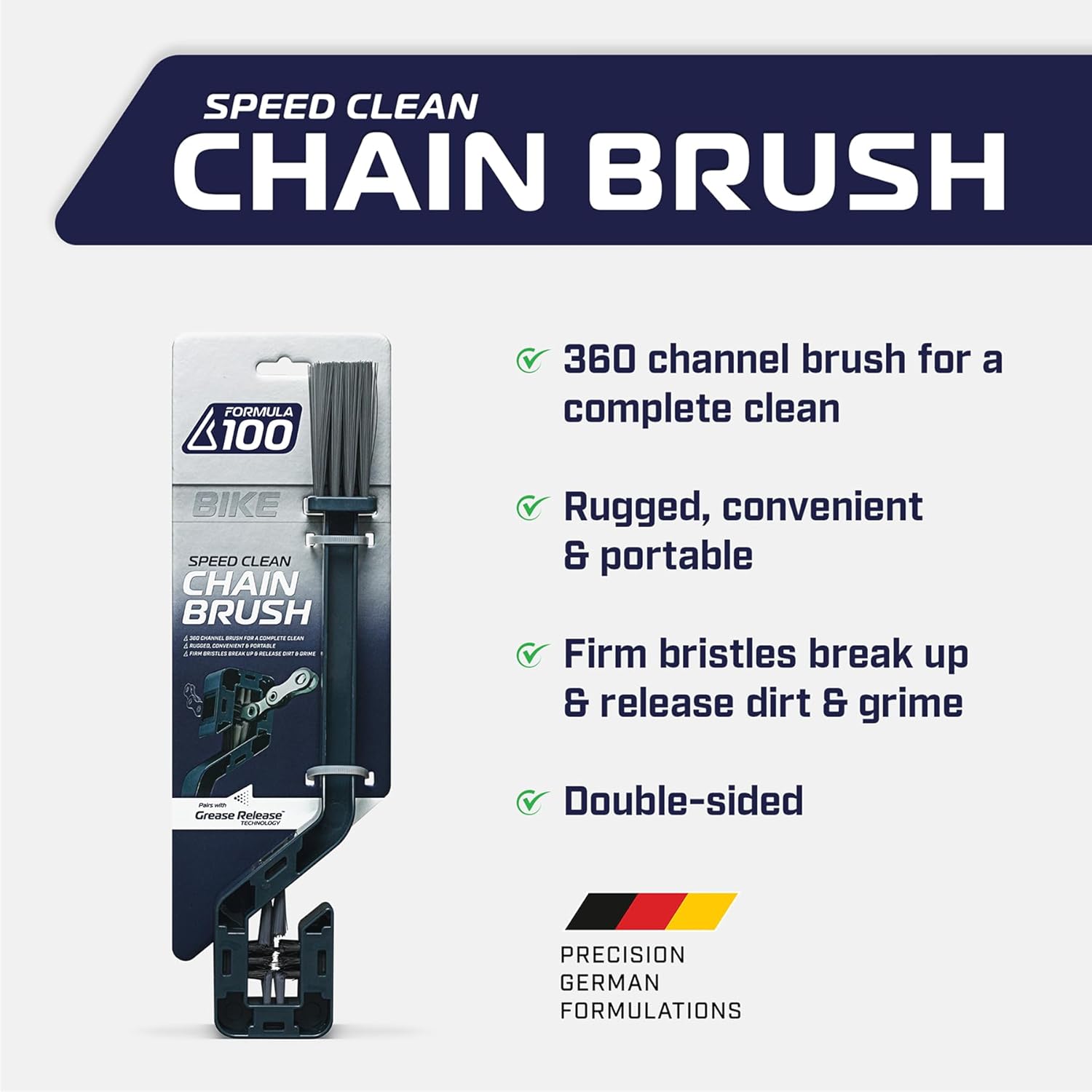 - Simply Spray, Scrub, Rinse & Dry: Start by spraying Formula 100 Chain + Drivetrain Degreaser. Allow 5-10 minutes for the cleaner to penetrate and release grime. Next, use the chain scrub brush to reach and clean those hard-to-reach areas of your chain, cassette, chainring, and pulleys. Then, gently rinse with water, dry with a cloth and follow up with a finish treatment of chain lube.