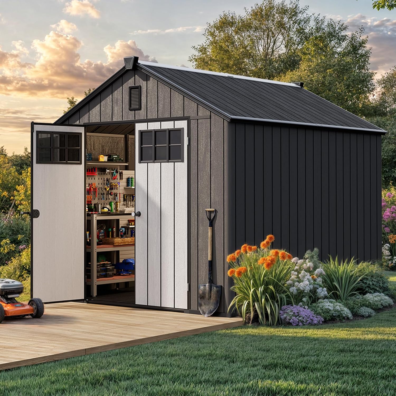 YITAHOME Outdoor Storage Shed 8x10 Ft, Plastic Storage Sheds with Floor, Lockable Doors, Windows, and Vents for Patio, Lawn, Backyard, Large Garden Storage for Bikes, Mowers, and Garden Tools, Black