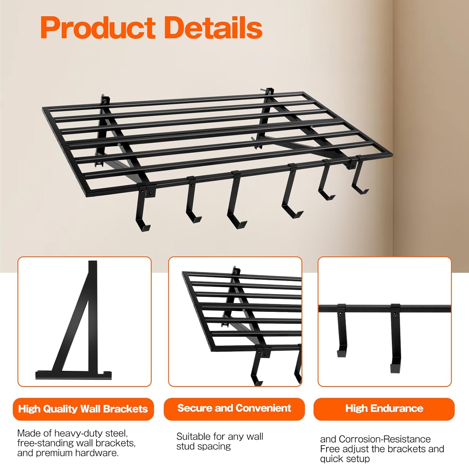 Garage Wall Shelving, 2X4ft Garage Storage Rack,Heavy Duty Wall Mounted Storage Shelf With 12 pc Hooks-Each Loads 260lbs Metal Wall Shelf,Black,2Pack