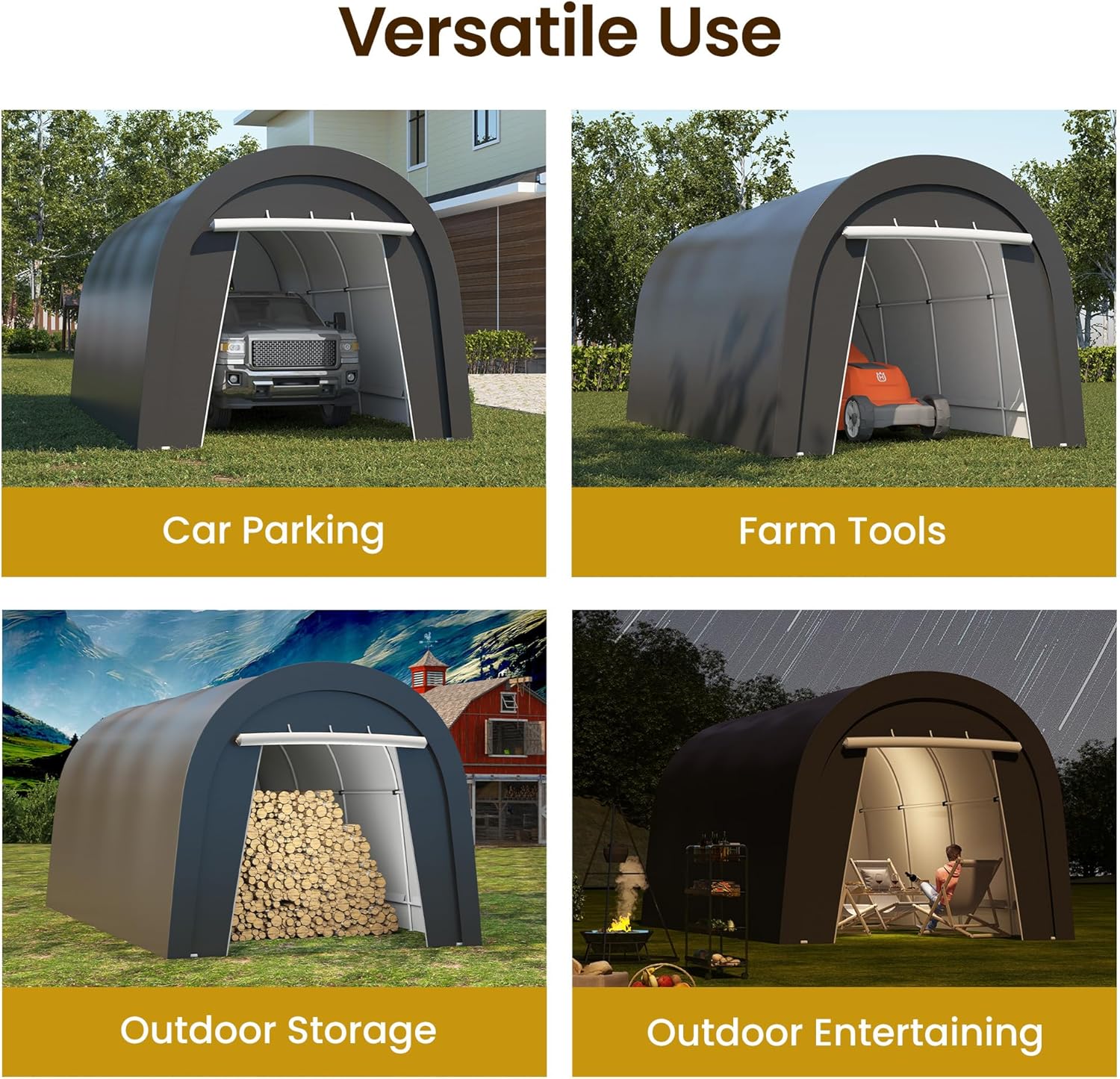 - DOMED CARPORT: 12x25 ft car port dome design prevents water and snow buildup, reducing structural stress and enhancing durability. The sleek, curved shape of the carport is more attractive and provides more interior space and better air circulation
