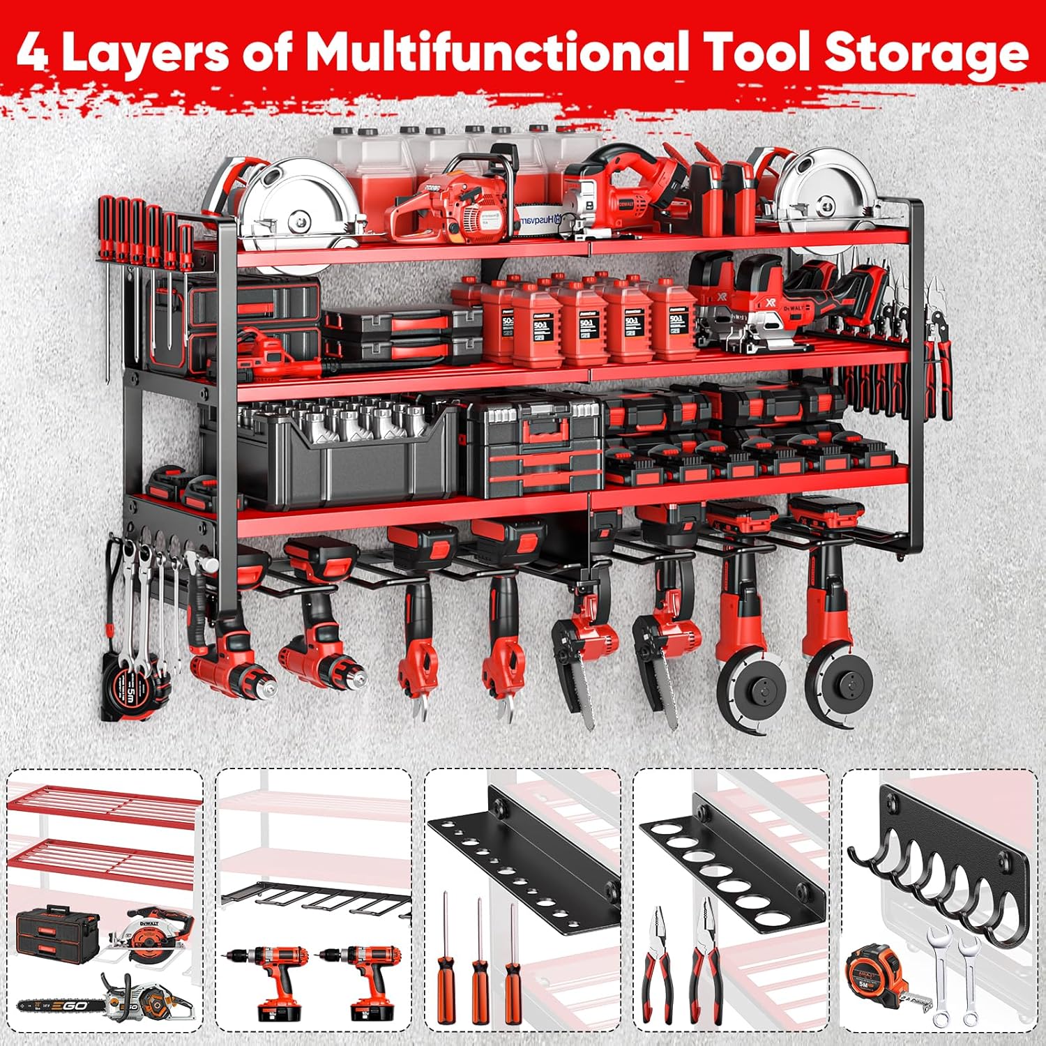 Upgrade Large power tool organizer Wall Mount,4 Layers Heavy Duty Metal Loads 400lbs Power Tool Hanger Shelf Battery Storage with 8 Cordless Drill Bit Holder,Utility Racks for Garage Tool Room