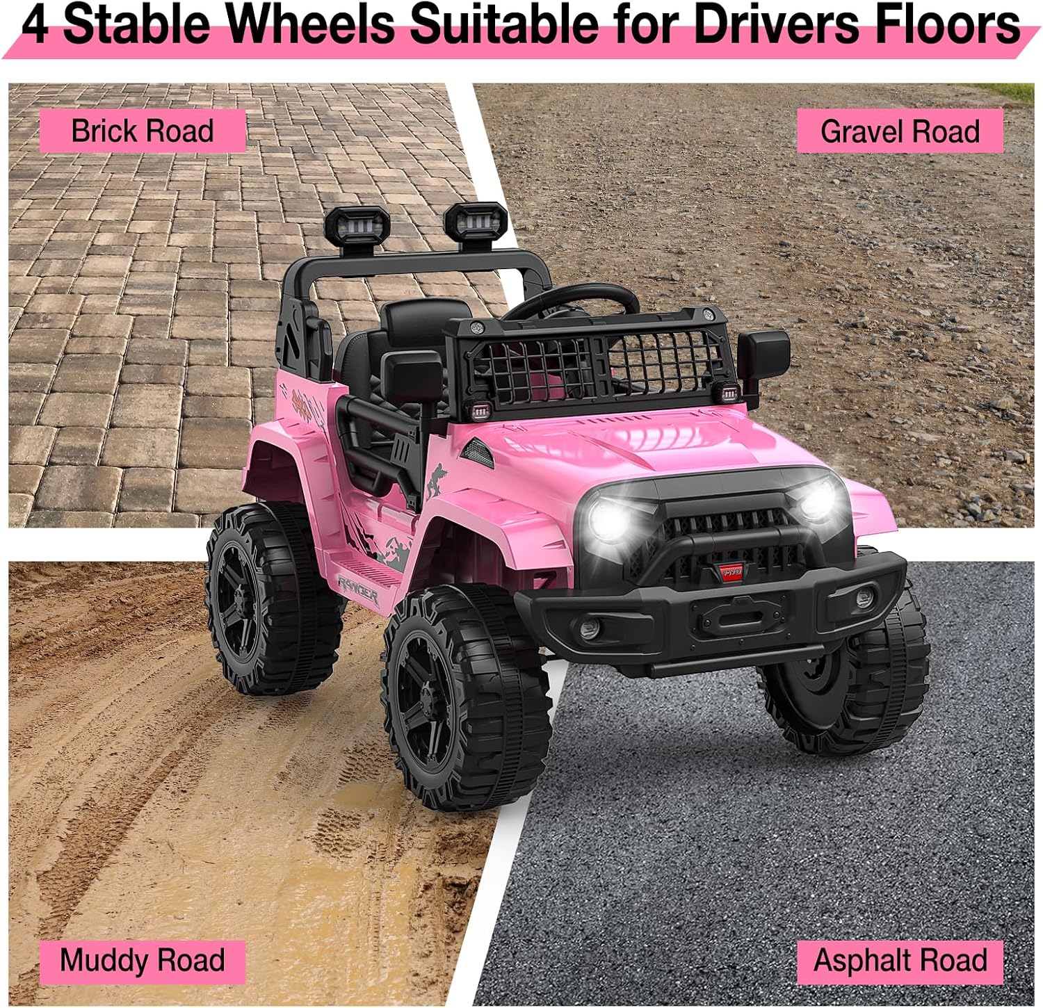 - β‘ 12V Power & All-Terrain Performance: High-torque 12V motor with puncture-proof tires conquers grass/concrete/driveways. LED headlights ensure nighttime visibility.
