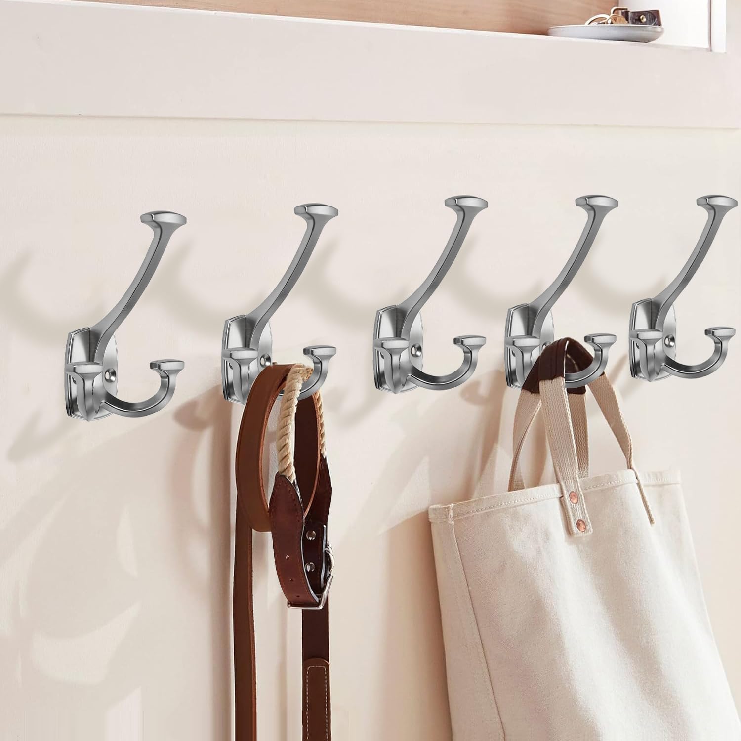 Large Wall Double-Sided Hook 2 Pack Brushed Satin Nickel Hook Decorative Heavy Duty Solid Large Coat Hooks for Towel Hanging Coats Robe Towel Bags Door Back 2 Prong Hooks