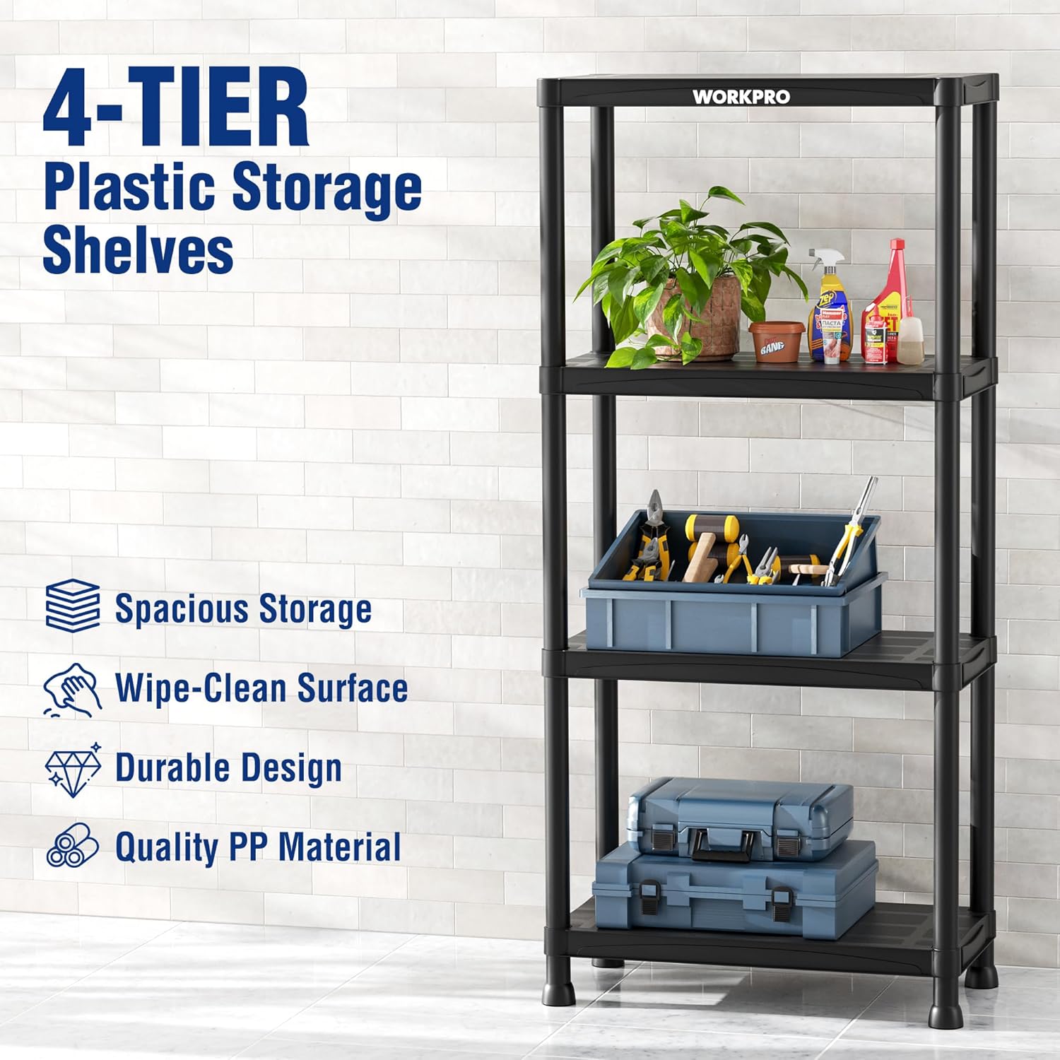 WORKPRO 4-Tier Plastic Storage Shelves, 400lb Capacity Shelving Unit, 51.4" H x 23.9" W x 12" D, Storage Rack for Garage, Home, Pantry, Office, Laundry, Tool-Free Assembly, Black