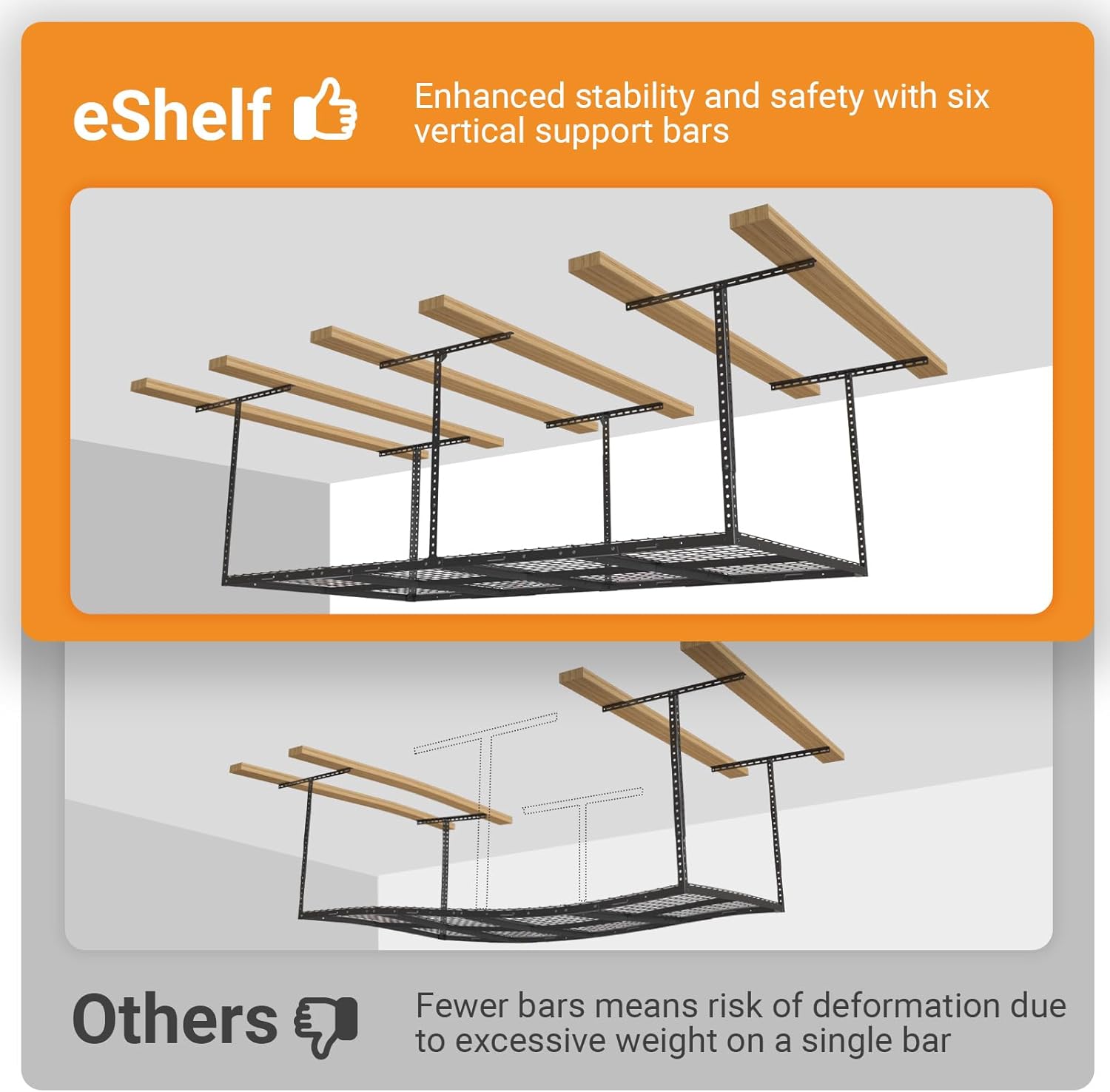 - Clear Floor Space: The overhead garage storage rack utilizes unused ceiling space, freeing up valuable floor space in the garage. It allows for Clear Floor Space: The overhead garage storage rack utilizes unused ceiling space, freeing up valuable floor space in the garage. It allows for vertical storage, maximizing storage capacity while preserving the maximum amount of floor space.vertical storage, maximizing storage capacity while preserving the maximum amount of floor space.