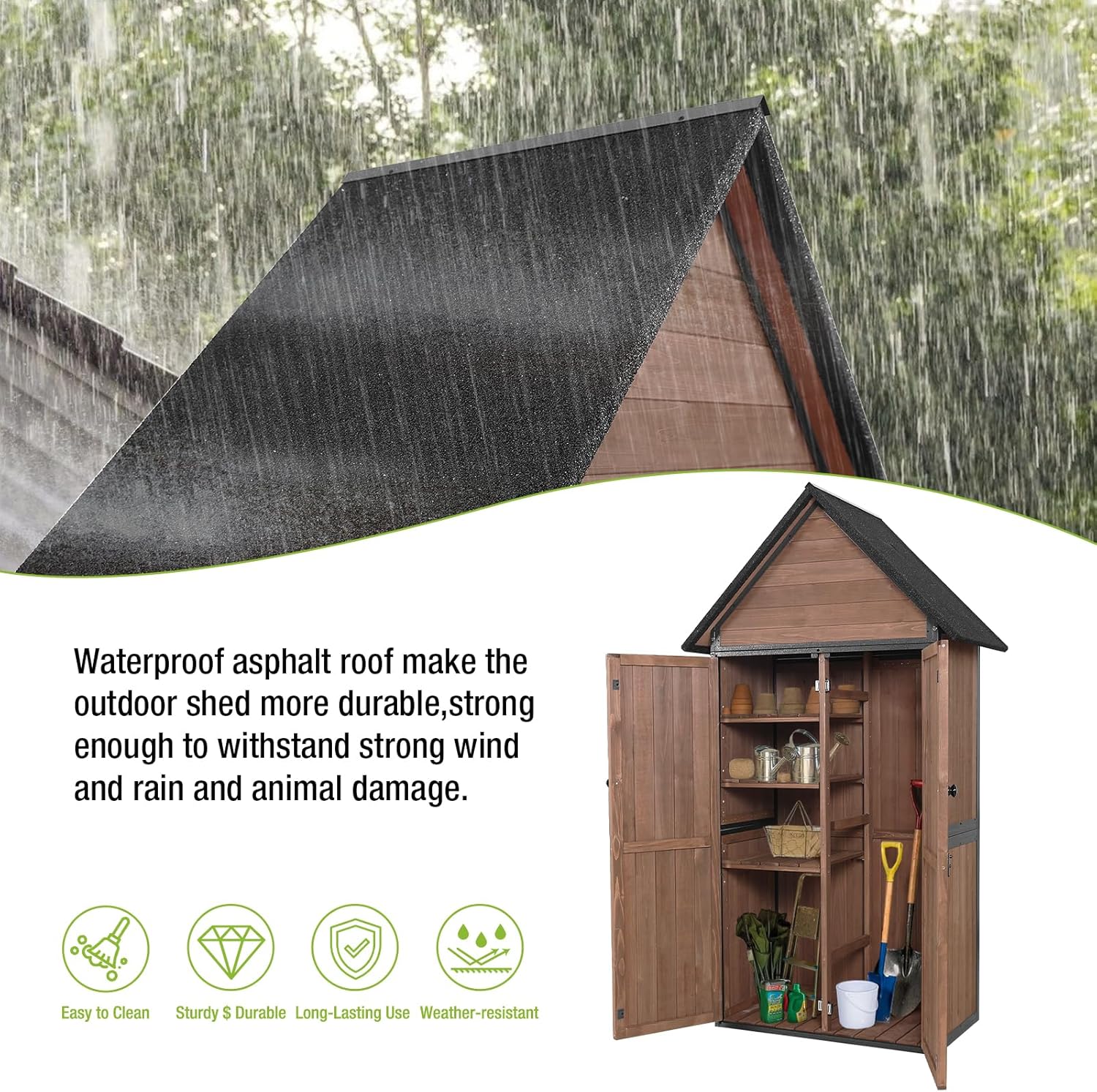 - 【Durable Construction】All-Around strong iron frame and waterproof asphalt roof make the outdoor shed more durable to use,prevent falling apart