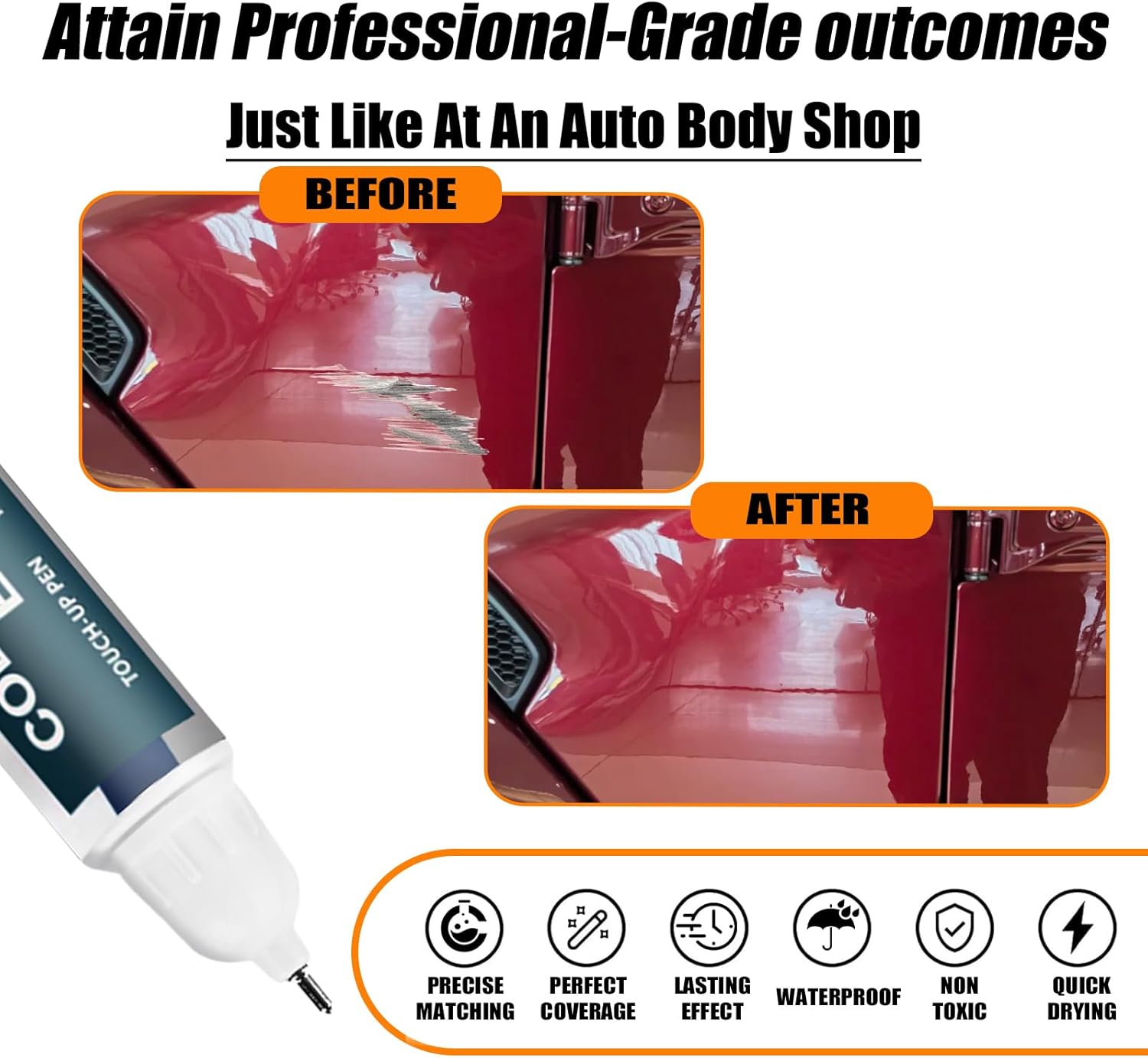 - ăRepair scratches quickly and simplyăThis car scratch repair paint has strong adhesion, anti-rust, and waterproof properties that protect your car's surface from further damage. With a 2-in-1 uses design, each bottle of car paint comes with a pen pin and brush, ensuring a hassle-free application