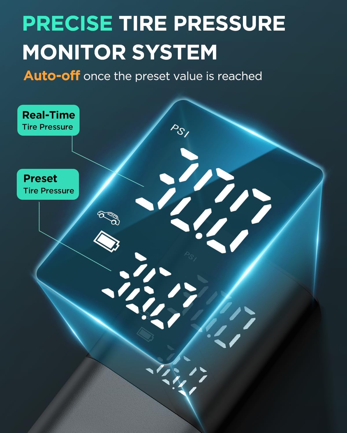 - ACCURATE TIRE PRESSURE GAUGE: Built-in Intelligent Chip, VACASSO KY103 advanced air pump for car tires features precision pressure monitoring and a large dual LED display, and it will be auto off as soon as preset pressure is reached to prevent overinflation, ensuring tire safety and freeing your hands for other tasks
