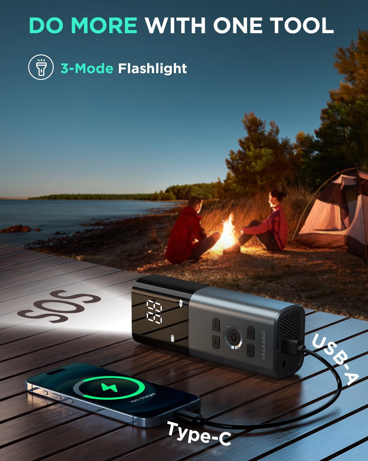 - PERFECT FOR EMERGENCIES: With its built-in 3-mode flashlight, this car tire inflator is perfect to keep in your car for nighttime tire inflation, roadside emergencies, or mobile device charging during power outages(1Γ USB-A to USB-C charging cable is included)