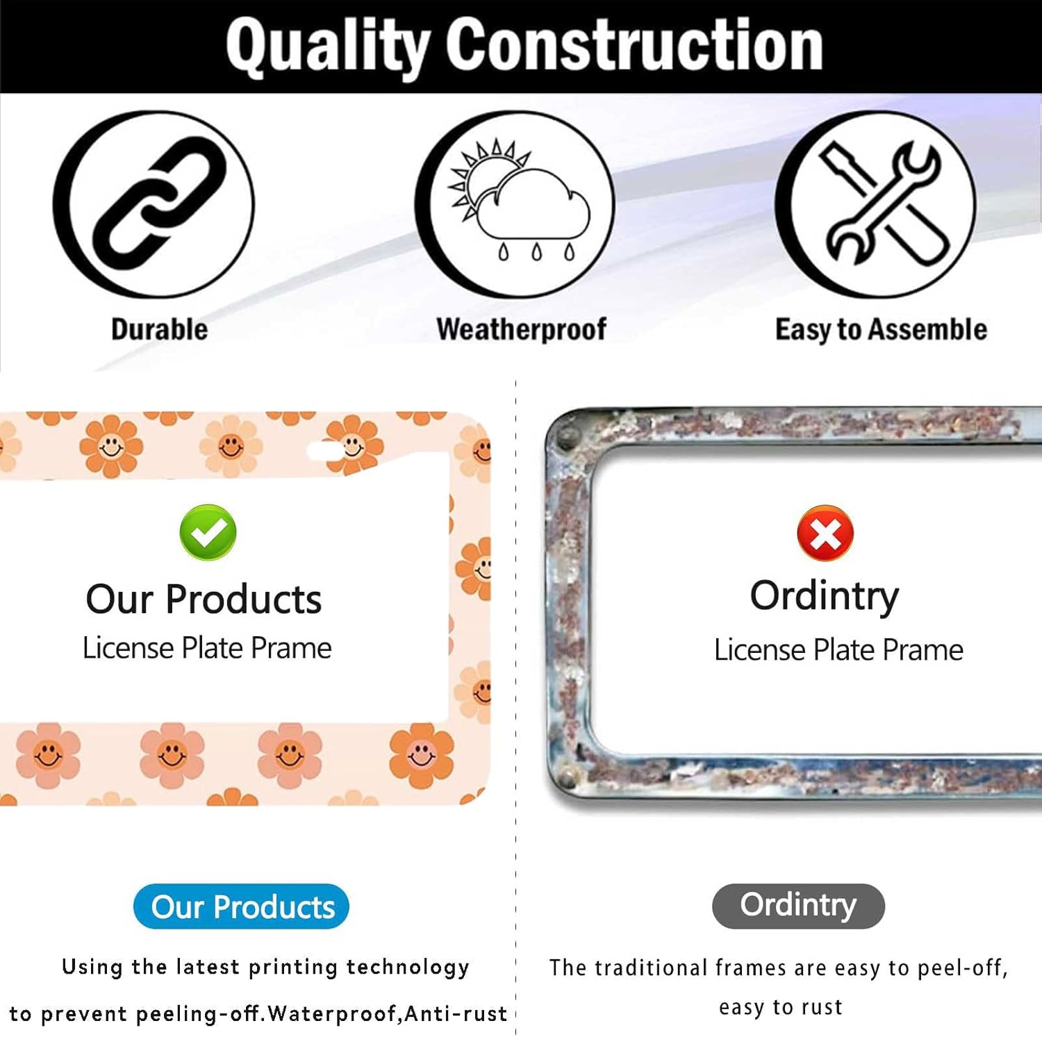- DURABLE CONSTRUCTION: Made from premium quality metal with weather-resistant coating.Rain or Shine, Stay Secure β Our Rust-Proof Smile Flower License Plate Cover Frame Wonβt Budge at Any Speed!