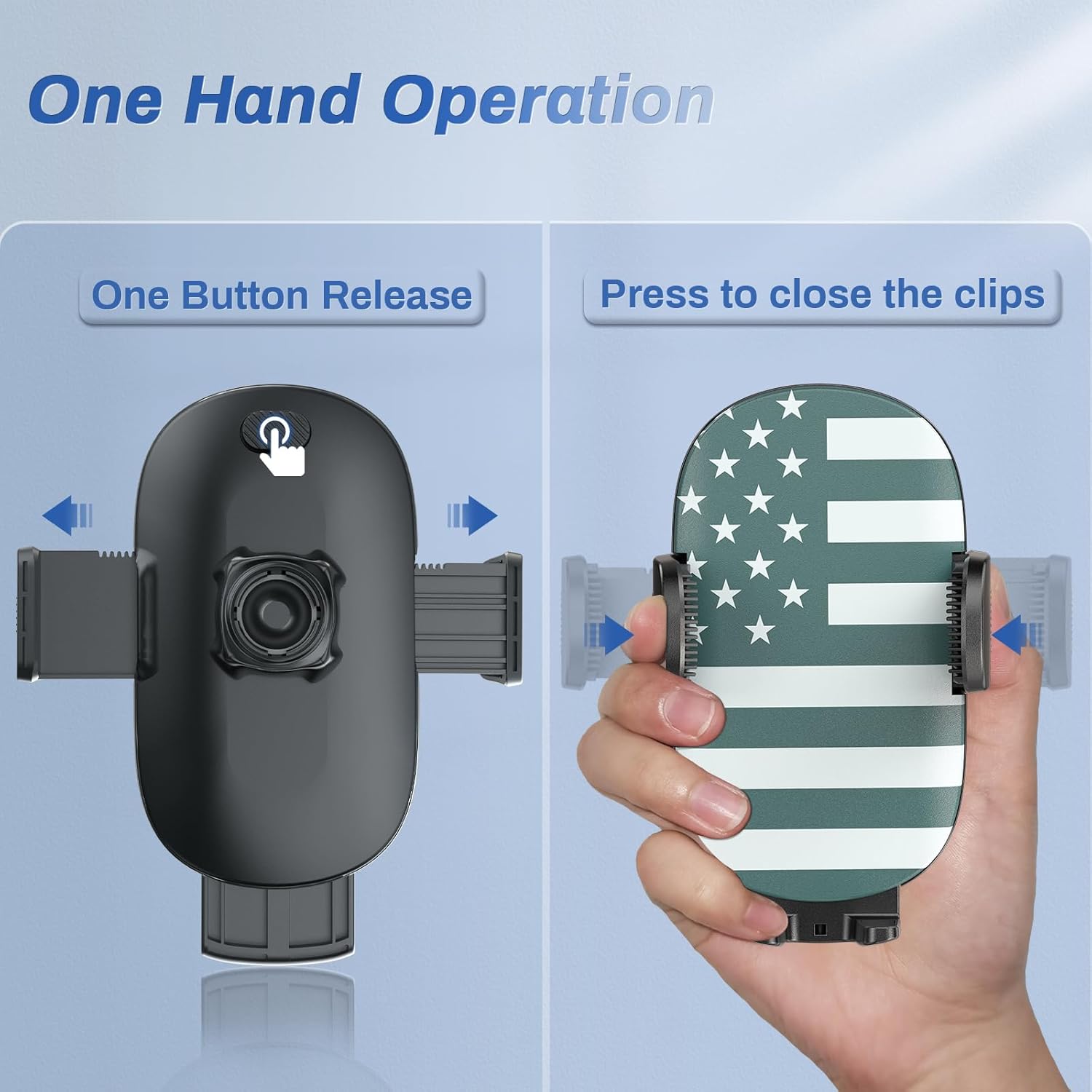 - Quick One-Button Release: Effortlessly mount and remove your phone with the one-button release system. Simply press the release button on the back of the cradle, and the clamp arms will smoothly slide open.β
