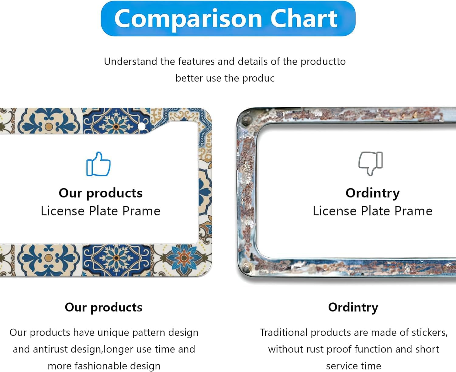 - ▶Quick Installation Design: Simply insert your license plate into the license plate holder and align the plate with the 2 holes on the frame for easy installation. The 2 Pieces aluminum boho mexican tile license plate frames accessories include 4 screw caps, 4 screws, 4 washers.