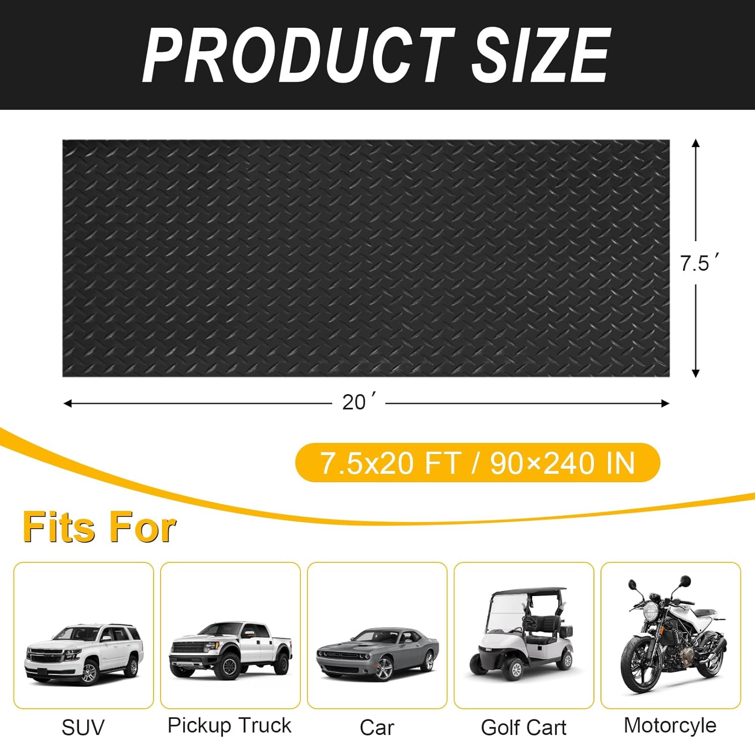 7.5x20 FT Garage Floor Mat, Flooring Roll with 20Pcs Tapes, 150 sqft Diamond Plate PVC Rubber Trailer Mat, Non-Slip Floor Mat for Garage, Warehouse, Gyms, Trailer, Pickup Truck (Black)