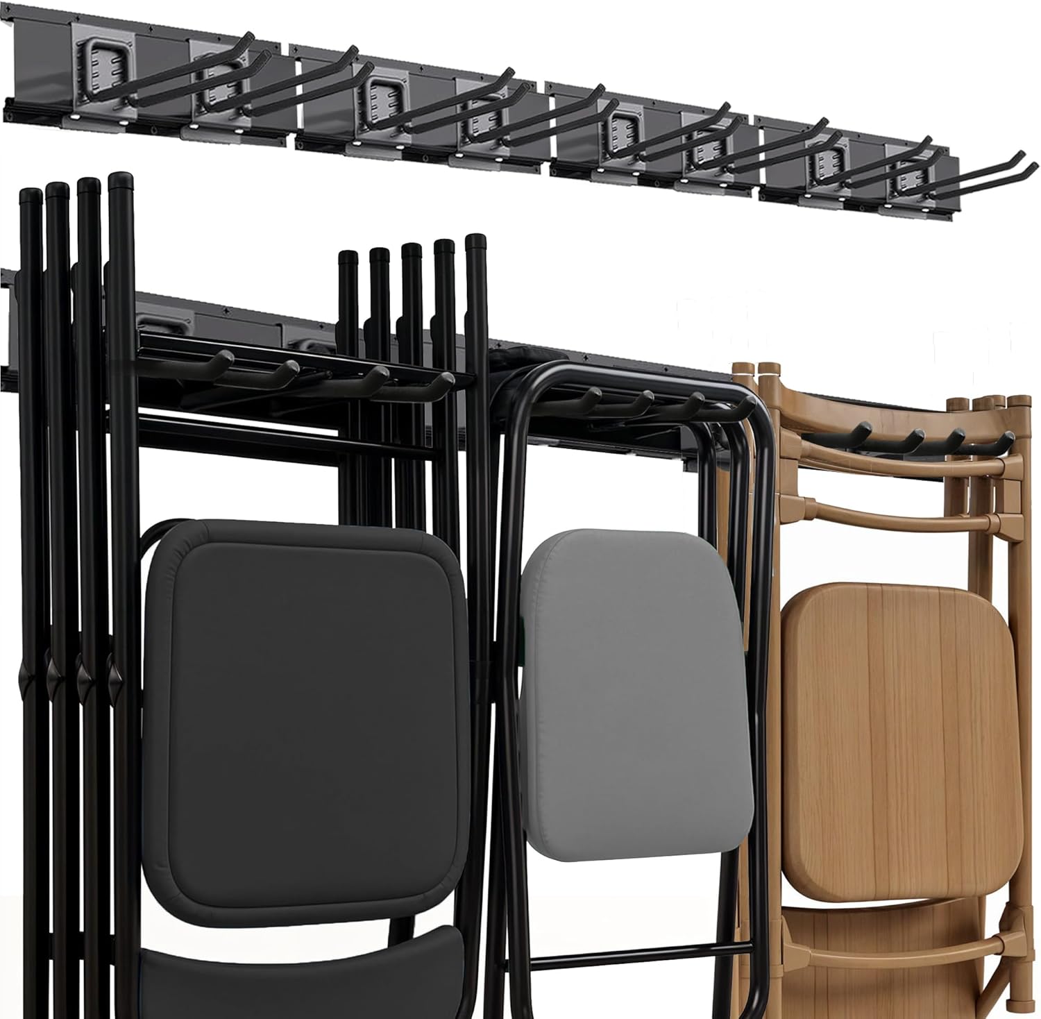 - Robust Load-Bearing Capacity – Each 8.5-inch steel hook supports up to 50 lbs and accommodates multiple folding chairs per hook, making it ideal for storing bulky items like power tools, garden gear, and event seating off the ground.