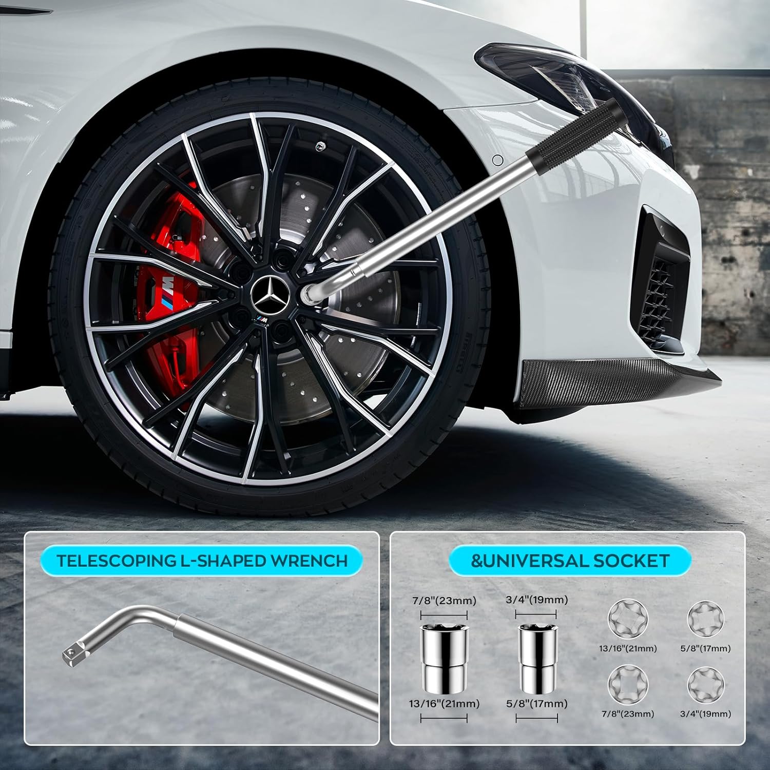 - 【Complete Tire Changing Kit】2.5T Scissor jack x 1; Benz Jack Pad x 2 ; Ratchet Wrenchx 1; Lug Wrench(17/19mm 21/23mm) x 1; Gloves x 1; Storage Bag x 1.he all-inclusive kit fits perfectly in your trunk or garage, ready to tackle any emergency tire replacement job.
