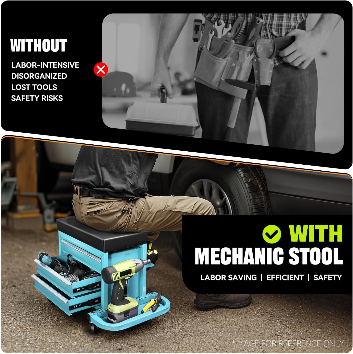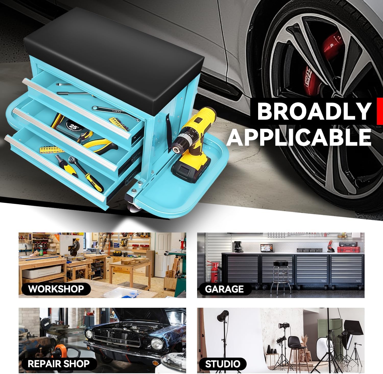 - Material: This 3-drawer rolling mechanics seat is made of reinforced metal, which can provide stability, equipped with a padded cushion that offers comfort for extended work sessions.