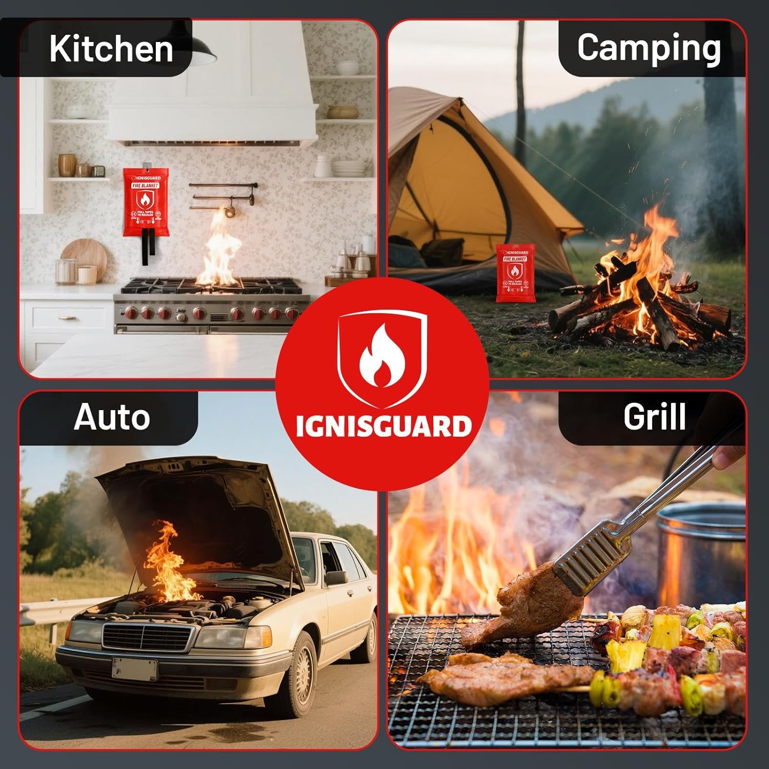- Efficient & Easy-to-Use: IGNISGUARD Kitchen Fire Blanket can quickly extinguish grease fires, liquid fires, and many other types of fires within seconds without causing chaos. Simply pull the two black tabs to deploy - no training required. It is designed as a very important part of high-priority emergency survival gear and supplies for home & kitchen, which can give you peace of mind. Use the IGNISGUARD Fireproof Blanket to be well prepared for home fire safety emergencies.