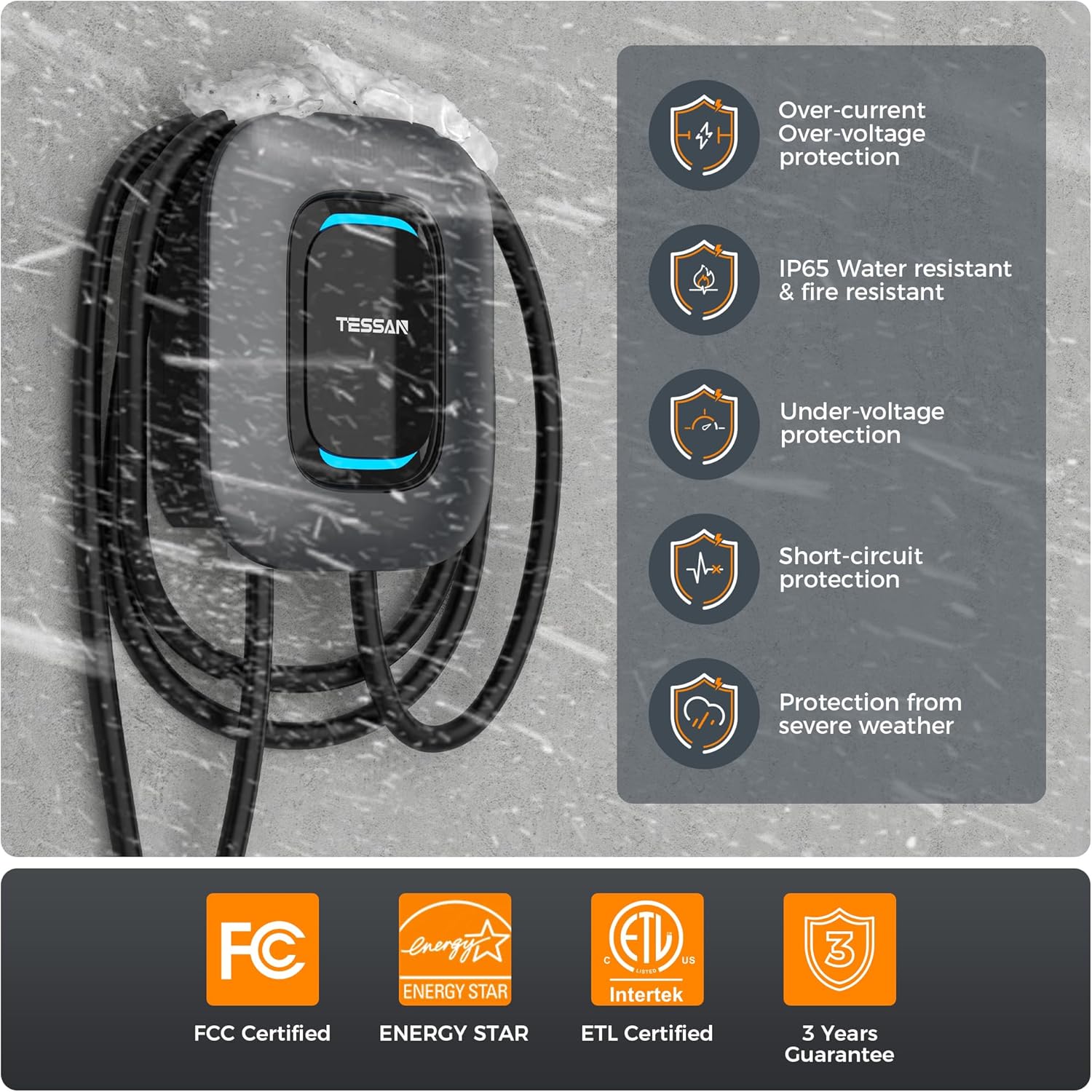 - Charging Conventient: TESSAN delivers reliable, safe, and efficient charging solutions for electric vehicle owners. The included 25ft cable ensures flexible charging at home, in garages, or outdoors, allowing you to charge anytime, anywhere.