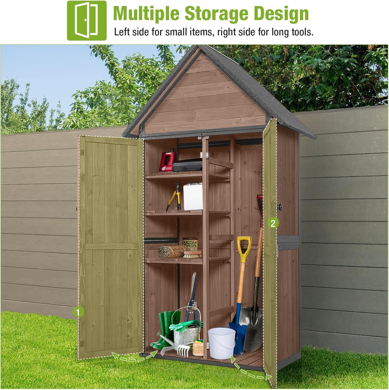- Water-Resistant Design: This garden storage tool shed has a sloped roof prevents water accumulation. Raised wooden floor prevents water ingress, ensuring a dry and secure storage space.