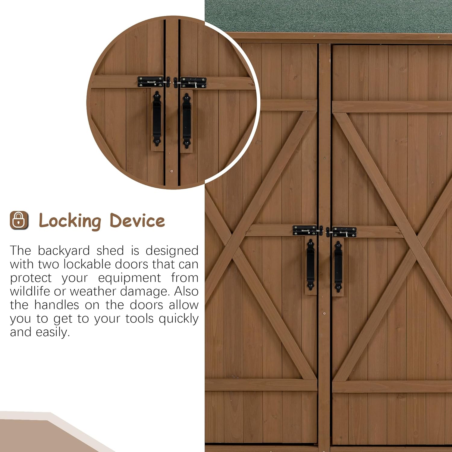 - SECURE LOCKABLE DOORS - Equipped with double doors and a metal latch, this garden storage shed keeps your tools safe and prevents them from falling off the shelves.