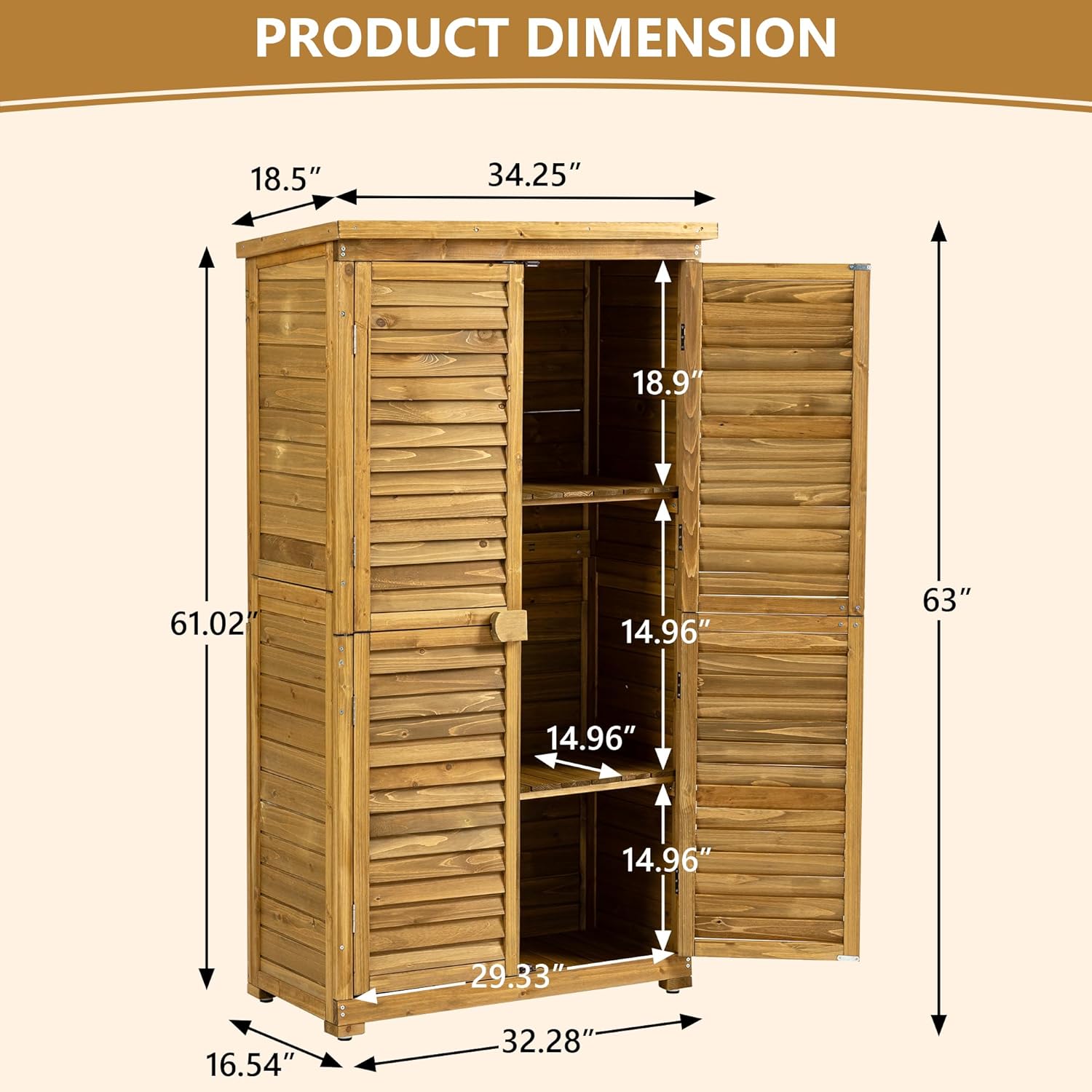 63 "H x 34.25 "L x 18.5 "W Vertical Garden Shed for Patio,Outdoor Wooden Storage Cabinet with Waterproof Roof, 2 Removable Shelves, and Adjustable Feet, Yard, and Garage,Natural Wood