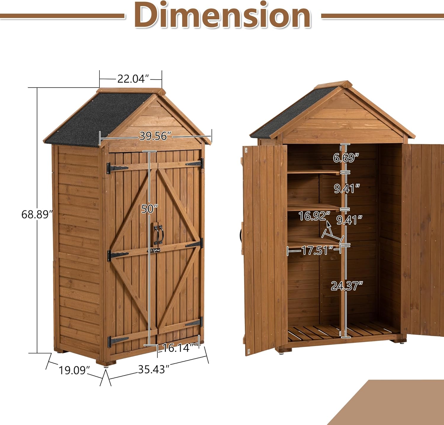 39.56"x 22.04"x 68.89" Outdoor Storage Cabinet with Removable Shelves, Waterproof Roof, and Adjustable Feet - Fir Wood Garden Tool Shed for Yard, Patio, Deck, and Garage,Yellow Brown