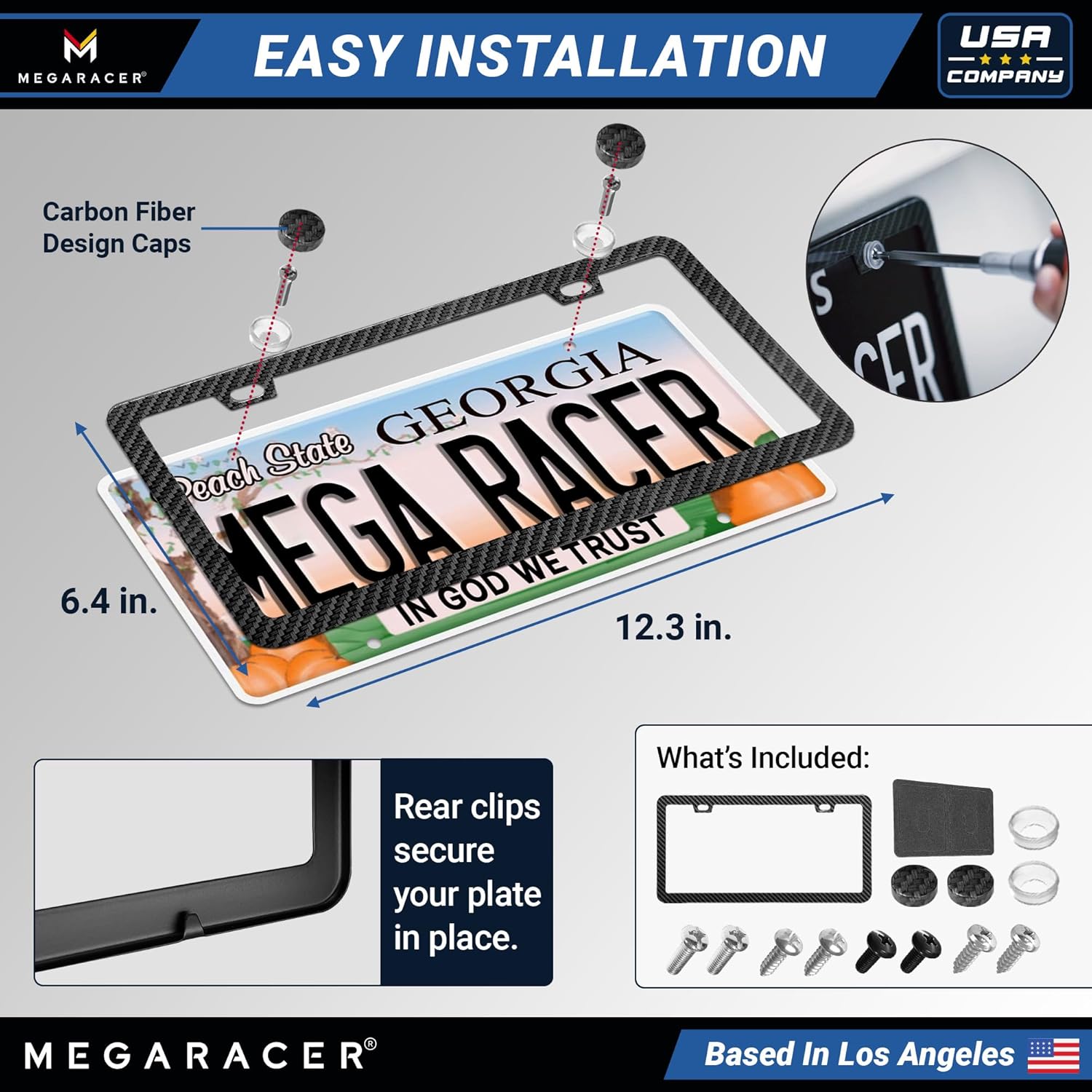 - CUSTOMER SERVICE: Mega Racer's 1 pc Carbon Fiber Design License Plate Frame will leave both you and your ride satisfied. If you have any questions please send us a message via Amazon Message and we will be sure to respond within 24 hours.