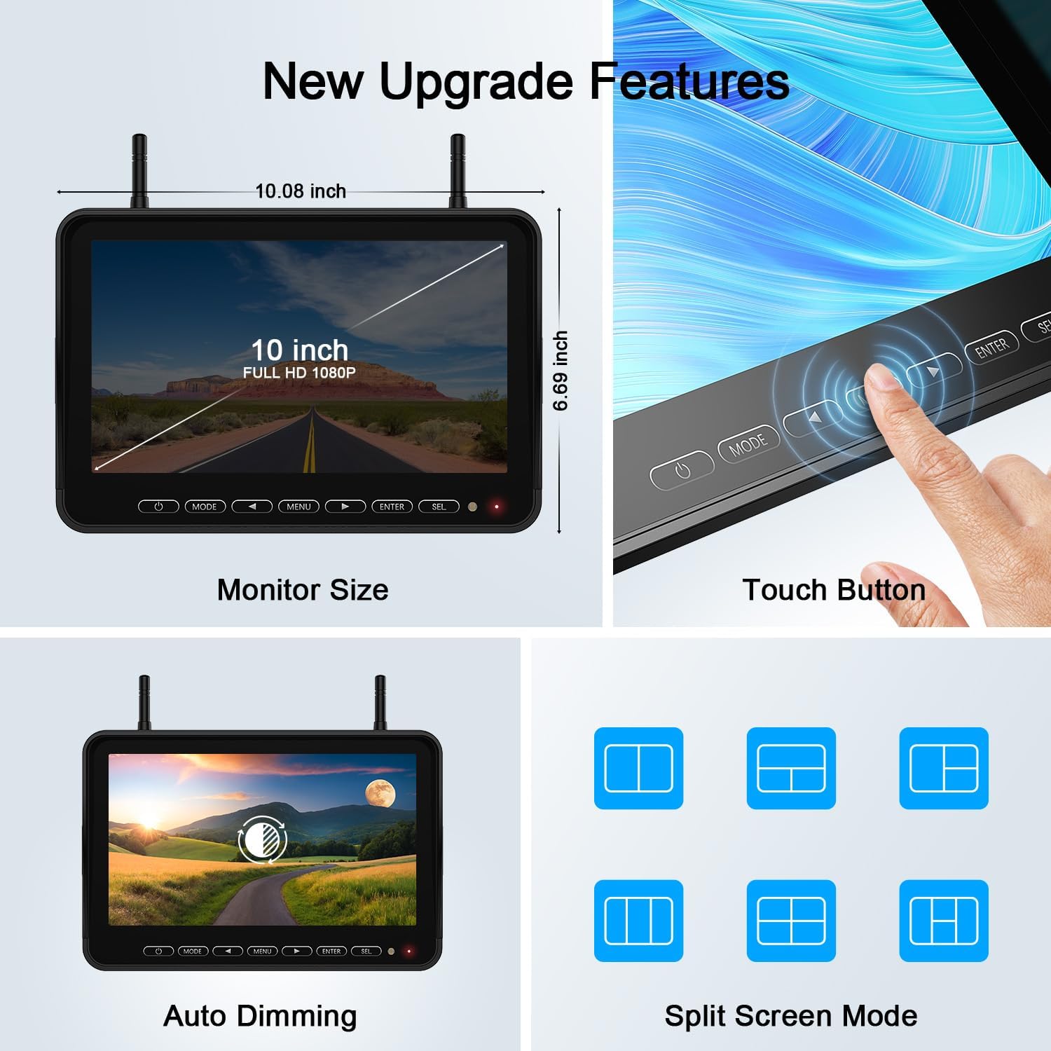 - Triple Split Screen & Full HD Stunning Visuals: 10" IPS monitor provides with crisp images and parking lines. Equipped with touch buttons, a touch of the response, faster and more convenient operation. With auto-dimming, screen will automatically adjust the right brightness, night driving will not be affected. It can support up to 4 cameras for full coverage and display in dual/triple/quad split screen mode.