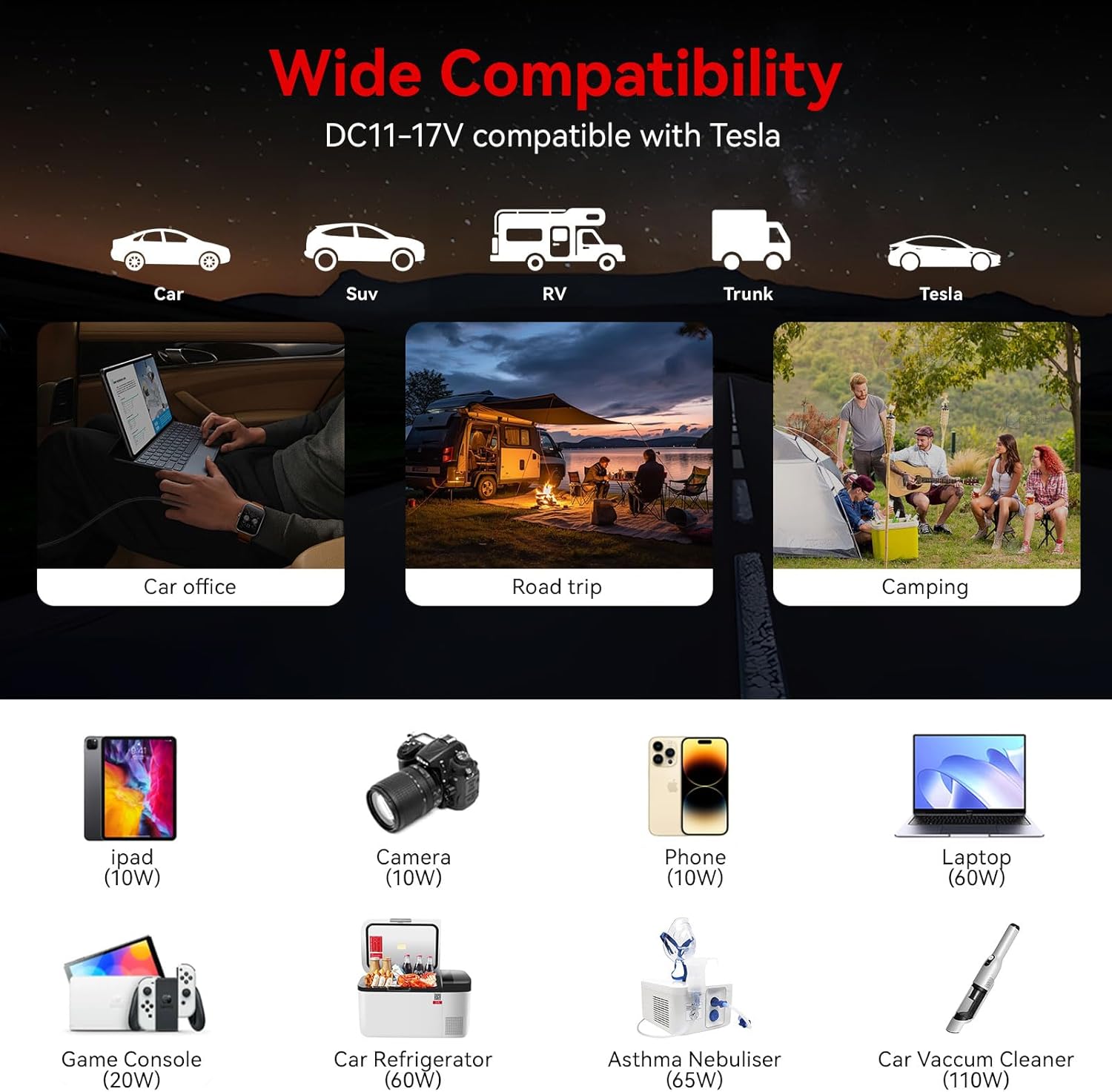 - 【Compatible with Tesla】The input voltage of the inverter is 11-17V, perfectly suitable for the 16V cigarette lighter socket of Tesla vehicles.