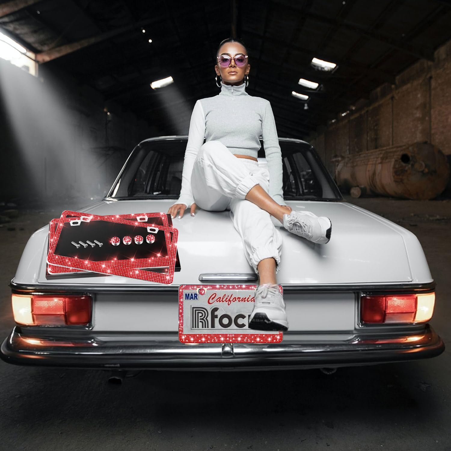 2 Pack License Plate Frames for Women, Sparkly Rhinestone Diamond Car Accessories with Glitter Crystal Caps (Red(2PCS))