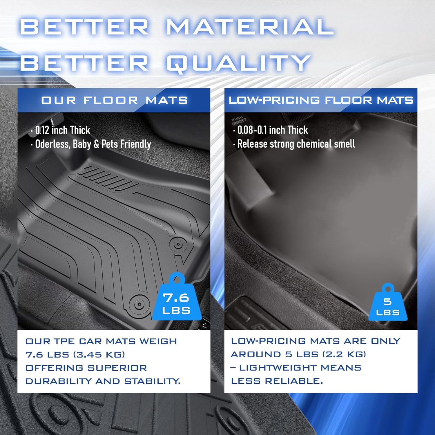 - ăSafe&Durable MaterialăSpecialized floor mats for Ford Mustang 2015-2017 2018-2022 2023 2024. Made of 3.3-mm-thick, odorless TPE material, these automotive floor mats are built to last in extreme weather conditions, so you never have to worry about cracking, curling, or damage.